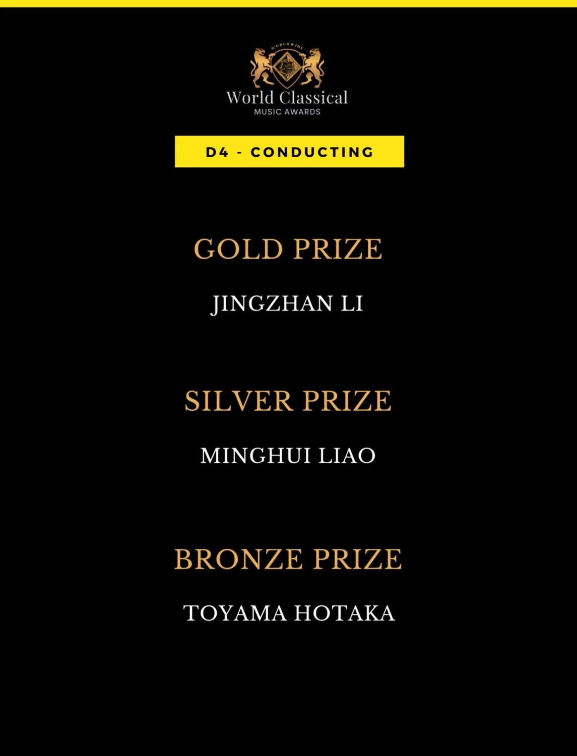 最终KY开元博士研究生李京展(指导教师:俞峰教授)通过执棒杭州爱乐乐团演出理查德·瓦格纳《齐格弗里的牧歌》与阿诺尔德·勋伯格《升华之夜》音乐会获得本次大奖赛指挥金奖与浪漫主义演绎奖两项大奖。银奖与铜奖先后由华人指挥家MINGHUI LIAO,日本指挥家TOYAMA HOTAKA获得。