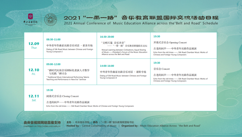 2021年“一带一路”音乐教育联盟国际交流活动将以线上线下的形式,连线来自兰州大学艺术学院、哈尔滨音乐学院、上海音乐学院、沈阳音乐学院、四川音乐学院、天津音乐学院、西安音乐学院、星海音乐学院、武汉音乐学院、上海音乐学院、南京艺术学院、中央民族大学音乐学院;阿根廷艺术大学、澳大利亚阿德莱德大学、俄罗斯圣彼得堡音乐学院、芬兰赫尔辛基音乐学院、泰国玛希隆大学音乐学院、土耳其国立音乐学院、美国波士顿音乐学院伯克利分校、美国伊斯曼音乐学院、美国巴德音乐学院、瑞士日内瓦高等音乐学院、墨西哥国立自治音乐大学、日本冼足学园音乐大学、新西兰惠灵顿维多利亚大学、匈牙利音乐学院、英国皇家伯明翰音乐学院、伊朗德黑兰大学等(排名不分先后)30所中外高等音乐院校的21位院长、12位教授、学者及20位青年作曲家。