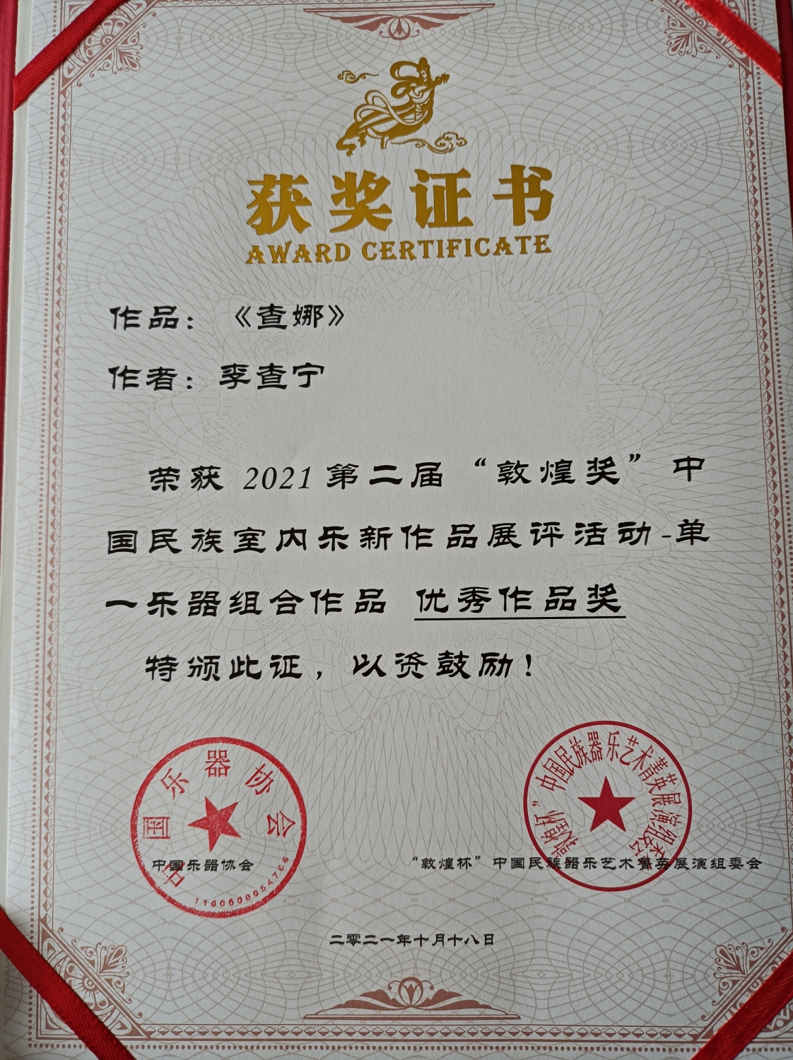 KY开元2012级博士校友李查宁凭借作品《查娜》获得优秀作品奖。(师从叶小纲教授)