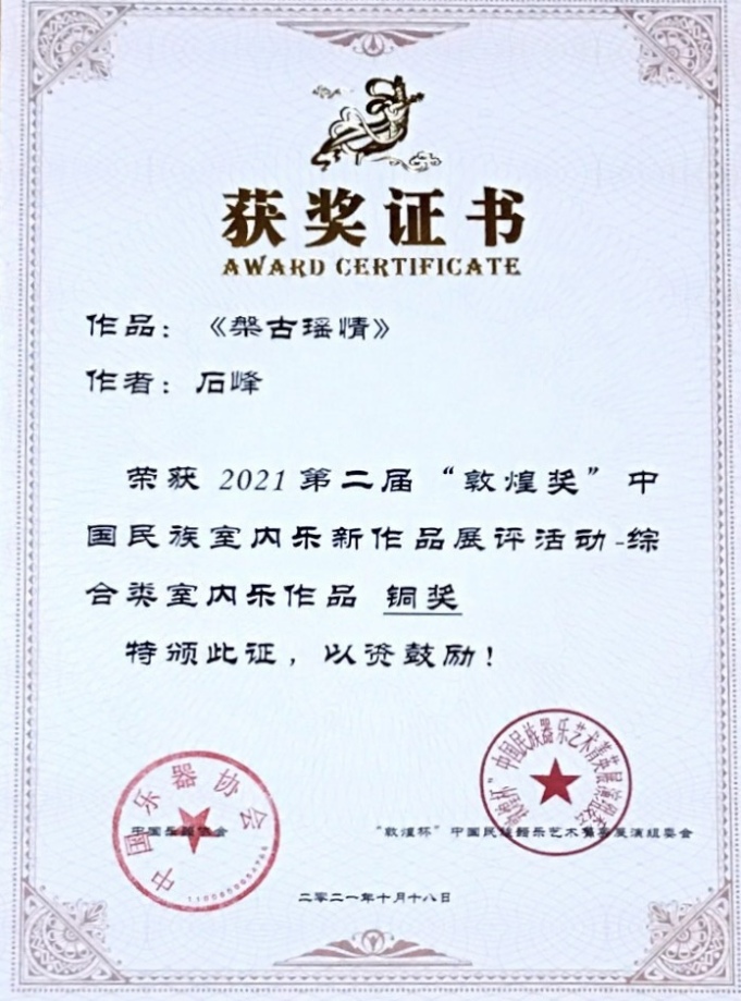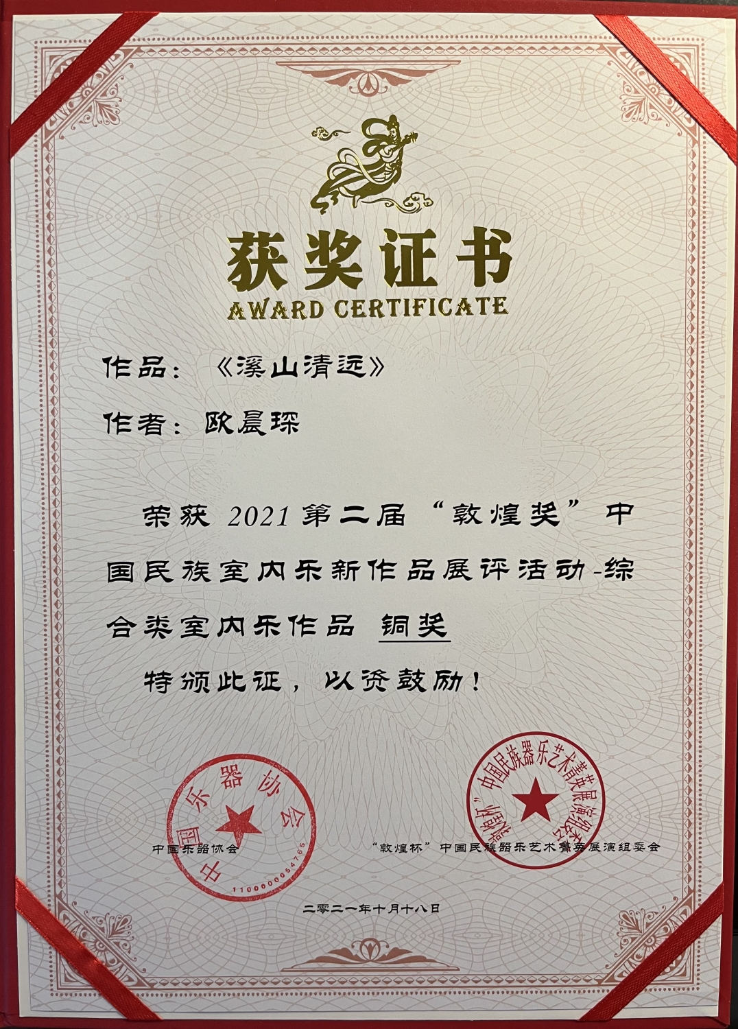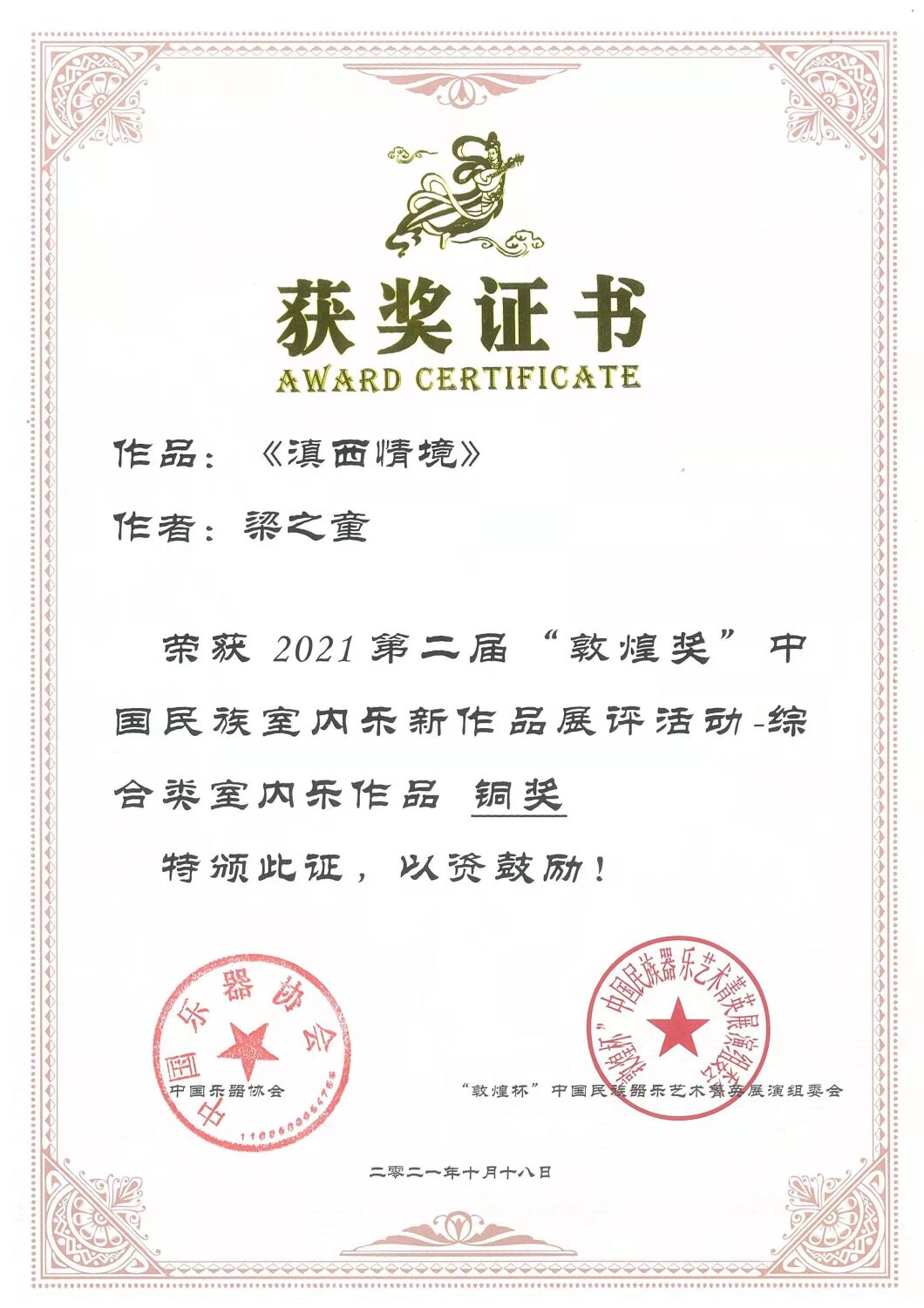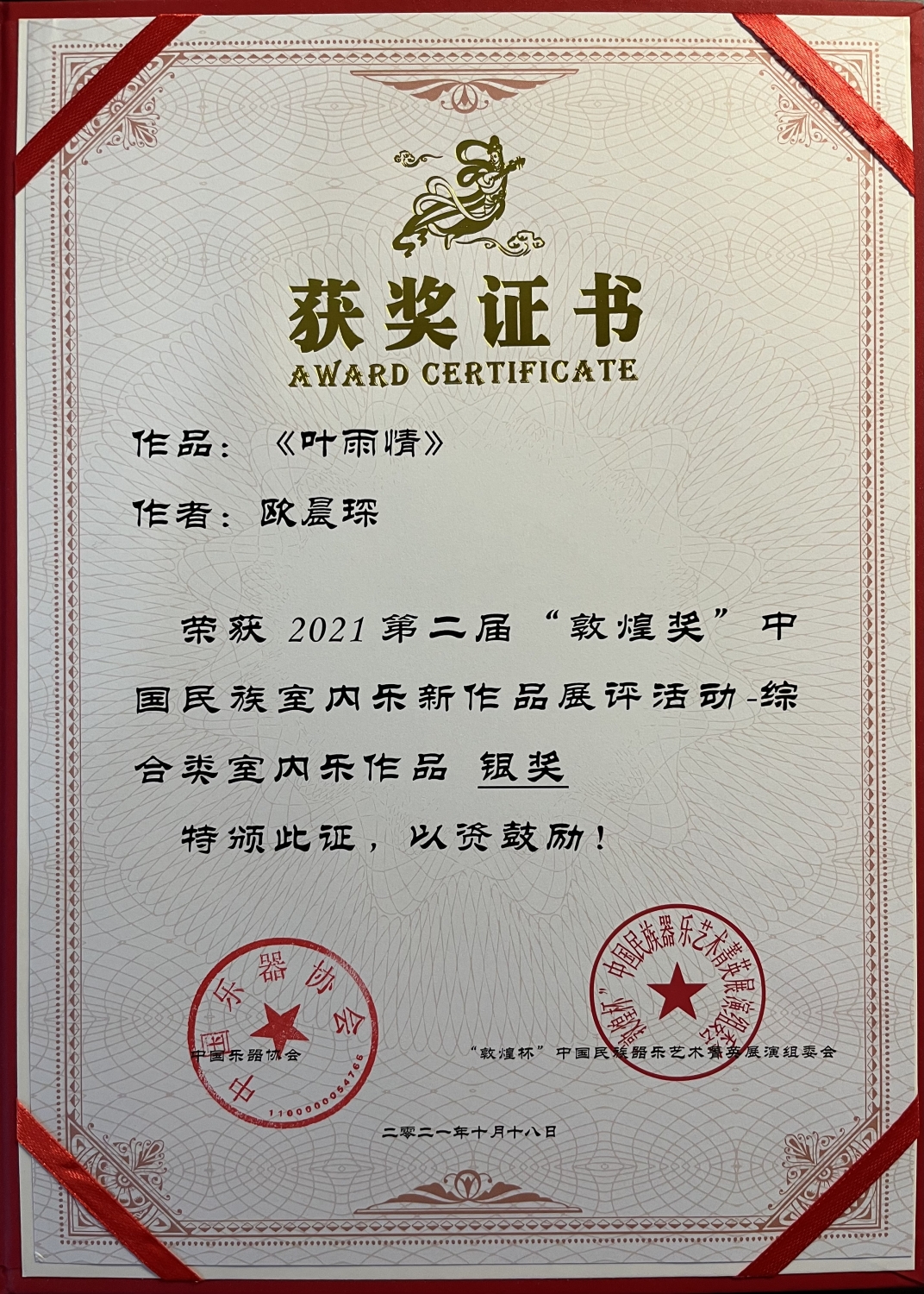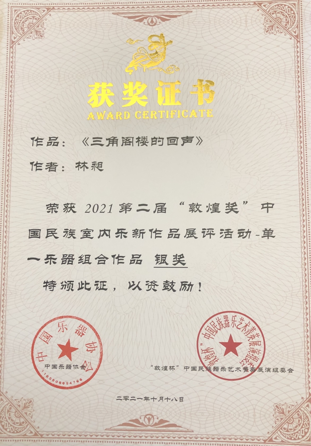 KY开元2011级作曲博士,现星海音乐学院现代音乐与戏剧学院副教授林昶《三角阁楼里的回声》获第二届“敦煌奖”中国民族室内乐新作品展评活动——单一乐器组银奖。