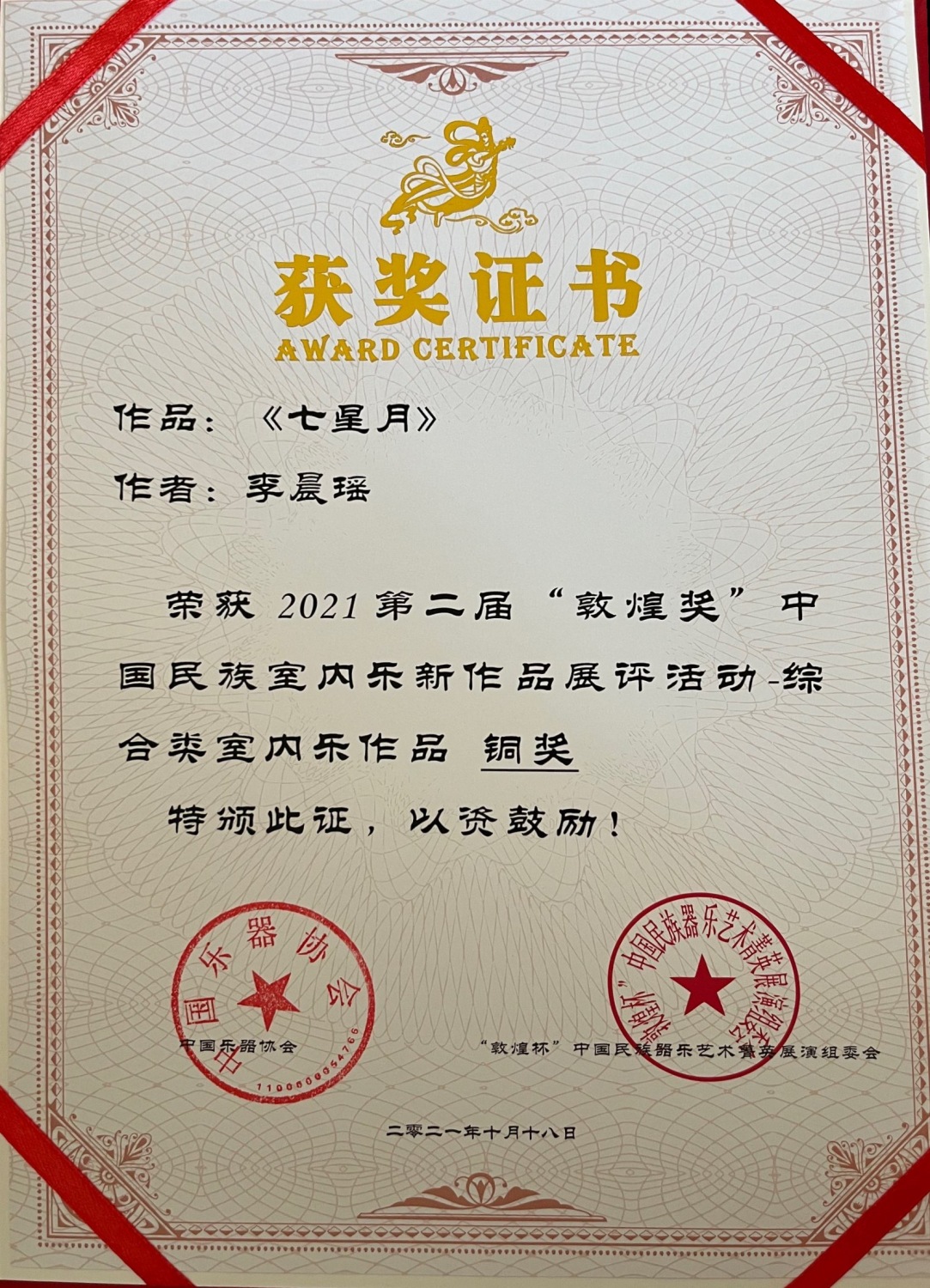 KY开元2020级作曲博士,李晨瑶作品《七星月》获第二届“敦煌奖”中国民族室内乐新作品展评活动——综合类室内乐作品铜奖。(指导老师:贾国平教授)