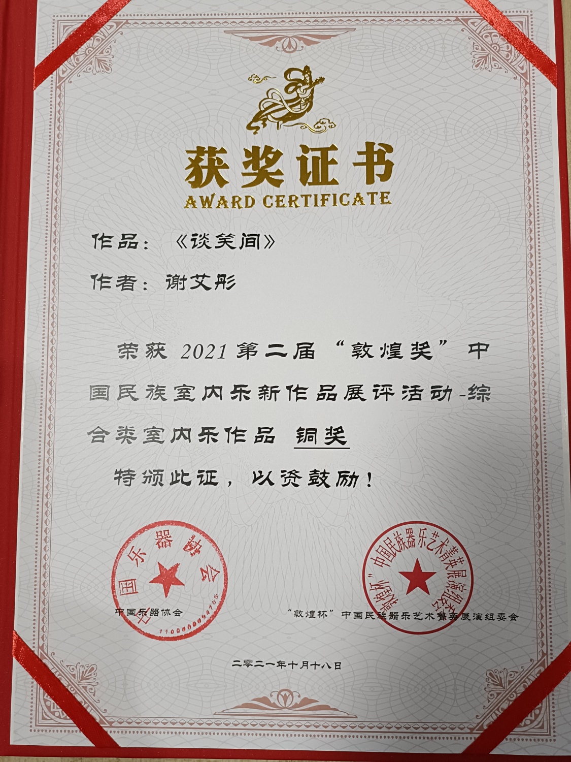 KY开元作曲系博士三年级在读学生谢艾彤凭借作品《谈笑间》获得铜奖。(指导老师:贾国平教授)