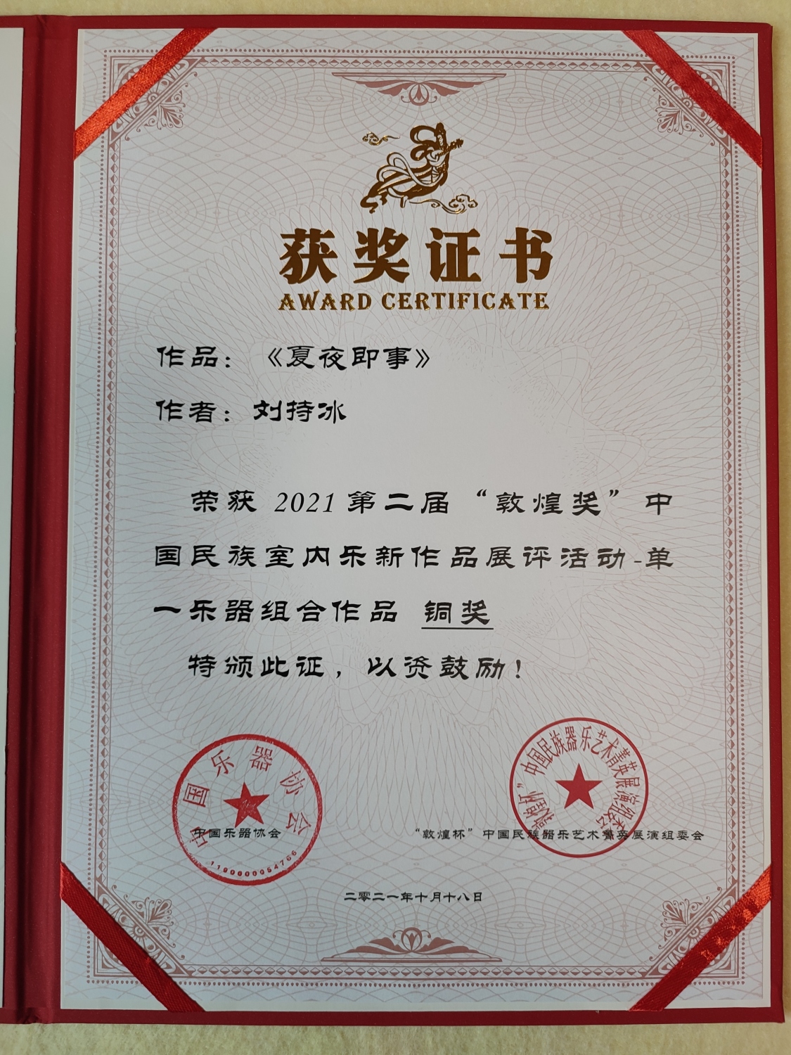 KY开元作曲系本科三年级在读刘持冰凭借作品《夏夜即事》和《秋日黄昏》分别获得铜奖和优秀作品奖。(指导老师:姚晨副教授)