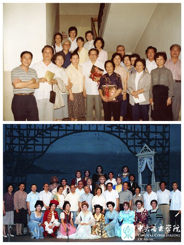 下,1987年,周巍峙同志观看声歌系学生排演的《蝴蝶夫人》《费加罗的婚礼》演出后,与学校领导和该系师生合影(站立第一排右6为沈湘)。