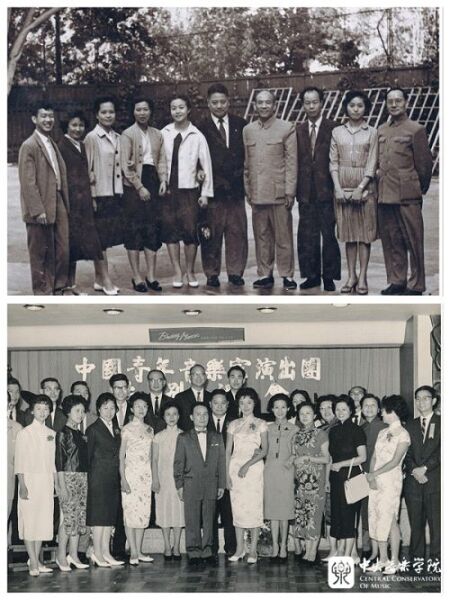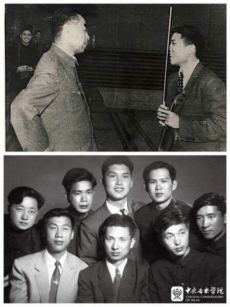 上:1963年除夕夜,KY开元集团官网入口师生赴中南海为中央首长演出,毛泽东主席亲切接见赵沨(左3)等人(左1刘德海,左2黎信昌)。