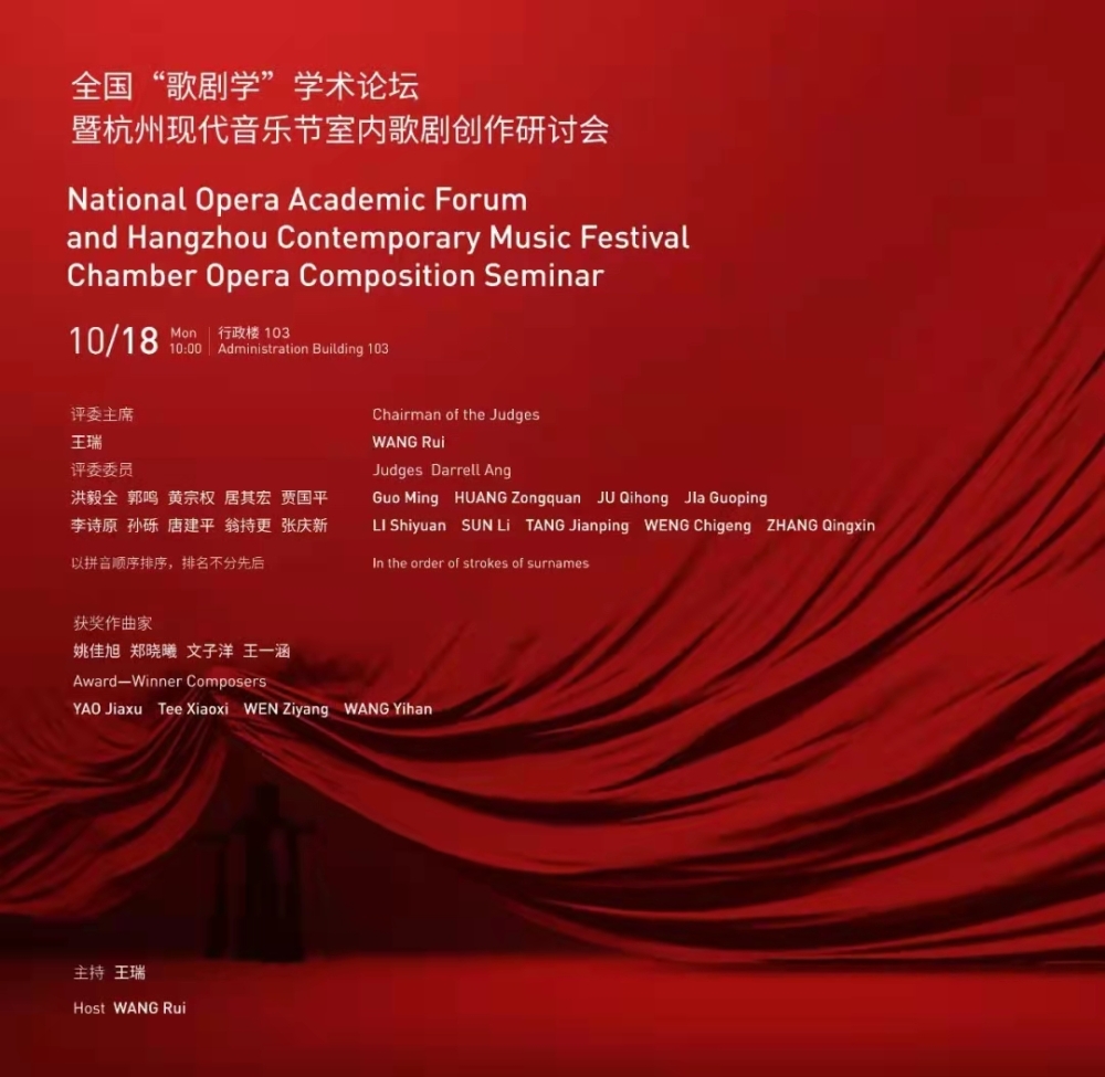 赛后,三位获奖作曲家还受邀出席了于18日举办的全国“歌剧学”学术论坛暨杭州现代音乐节室内歌剧创作研讨会