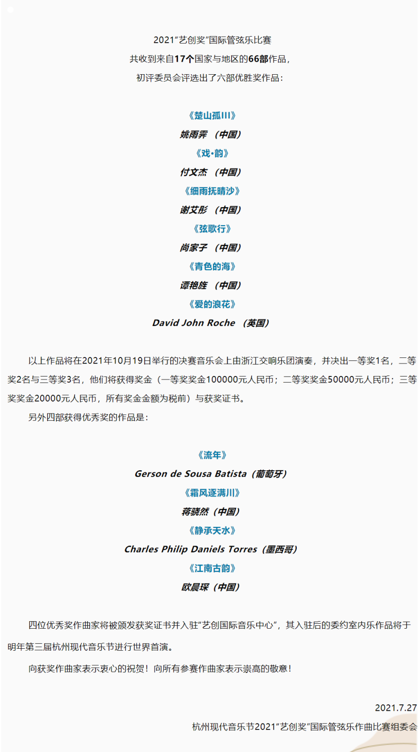 本届“艺创奖”国际管弦乐作曲比赛征集到来自17个国家及地区的66首参赛作品,经过为期两个月的评选,最终六首作品入选决赛音乐会。