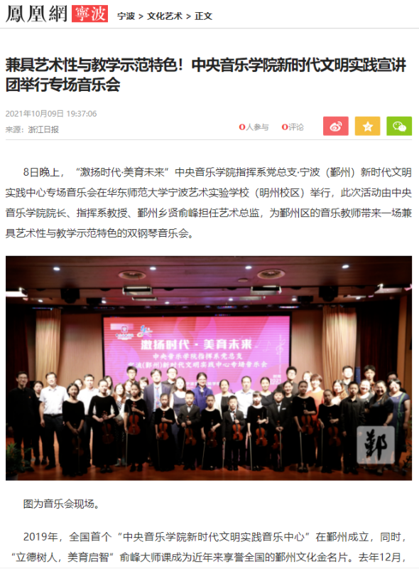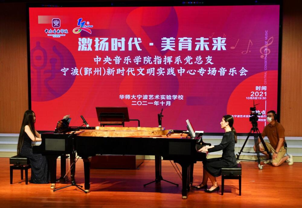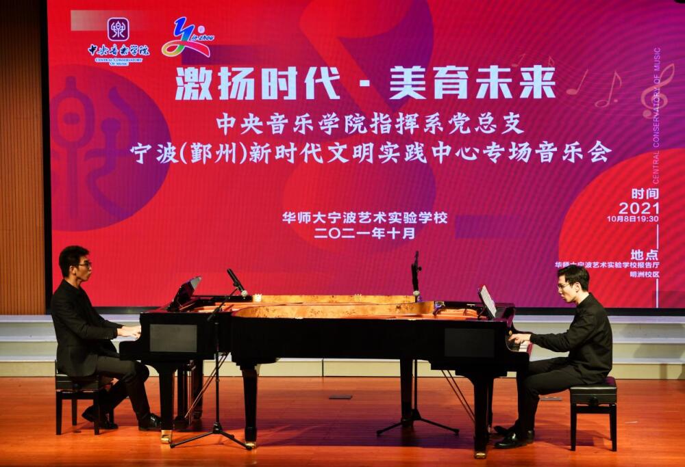 KY开元集团官网入口指挥系党总支在宁波党建活动期间恰逢江北区“KY开元集团官网入口新时代文明实践音乐中心”成立。仪式上来自KY开元集团官网入口指挥系党总支学生支部的两位硕士研究生张正宸和于健涛为在场嘉宾表演了钢琴四手联弹《歌唱祖国》,获得在场观众的热烈掌声。本次活动是指挥系党总支践行“新时代新思想”的充分体现,使广大党员充分体验到学院落实新时代文明实践工作的决心。党员师生纷纷表示在美好时代的大潮中,应尽自己努力,提高思想意识,发挥专业本领,投身到祖国需要的地方。