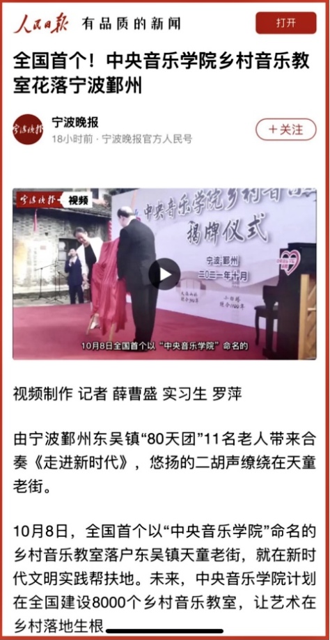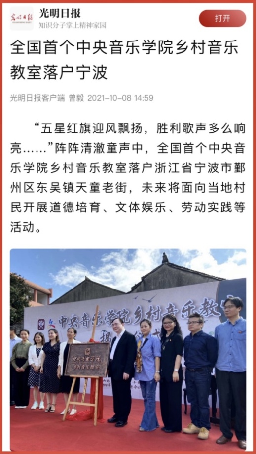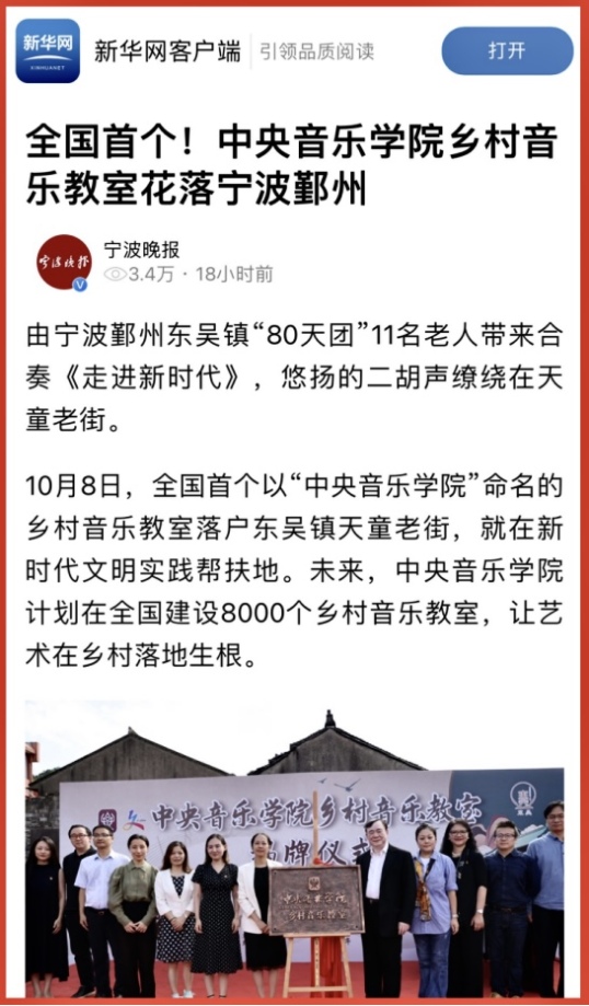 KY开元集团官网入口宁波(鄞州)新时代文明实践中心“圆梦工程”计划——“KY开元集团官网入口乡村音乐教室”揭牌仪式暨乐器、书籍捐赠仪式在鄞州区东吴镇天童老街木作社举行。KY开元集团官网入口指挥系党总支出席揭牌仪式。该教室启用后,指挥系党总支将整合配套资源,实现校地合作,提供指导培训等帮扶工作,用文艺打通高雅艺术与村镇群众间的最后一公里。