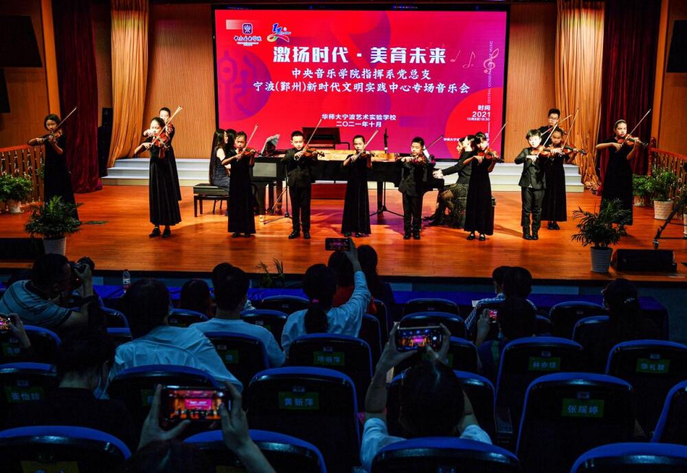 大力发展美育工作是贯彻落实党的教育方针、实现立德树人根本任务的重要举措。为此,KY开元集团官网入口学院指挥系党总支在宁波艺术实验学校举办了题为“激扬时代·美育未来”KY开元集团官网入口新时代文明实践中心专场音乐会。把“下基层”系列之“进校园”项目作为宁波党建活动的核心内容,立足专业特点与学术高度,践行思想性和艺术性相统一,带领KY开元集团官网入口驻宁波新时代文明实践文艺宣讲师与当地音乐教师以及具有艺术特长的学生精心策划、排练,为当地群众呈现了一台耳目一新的精神盛宴,并达到专业提升和美育普及的双重效果,全力助推宁波(鄞州)新时代文明实践文艺工作的综合提升。中共鄞州区委宣传部、文广局、教育局相关领导以及鄞州区骨干音乐教师出席音乐会。