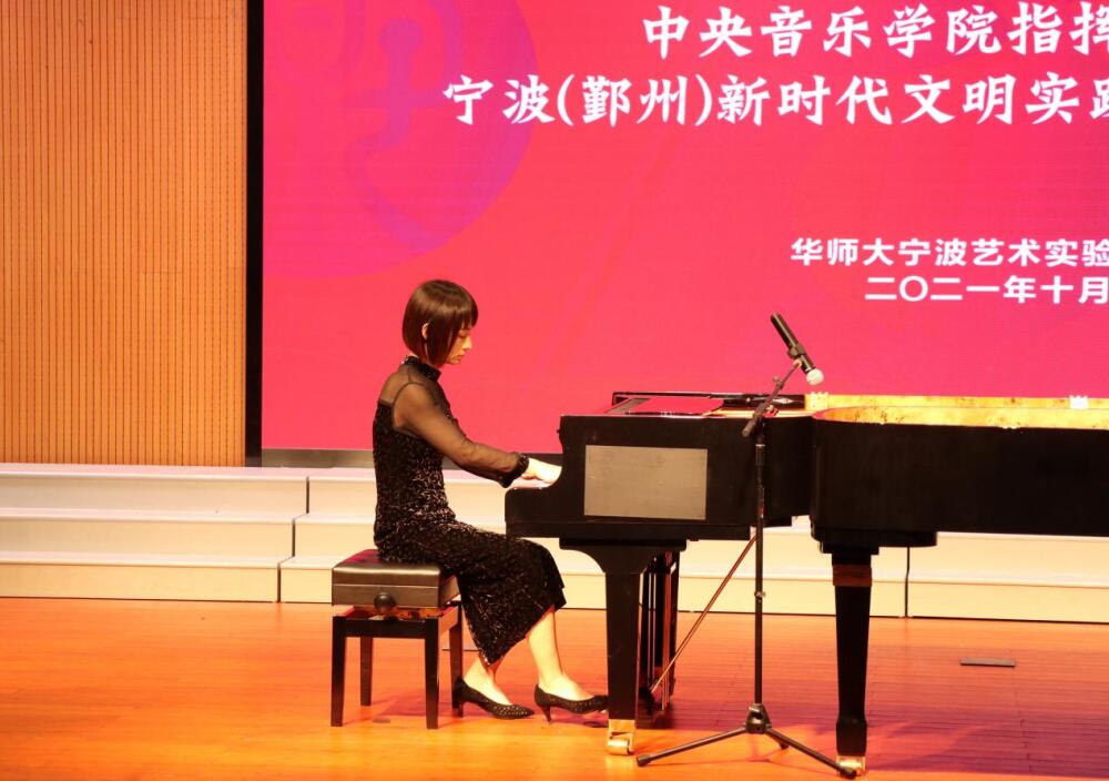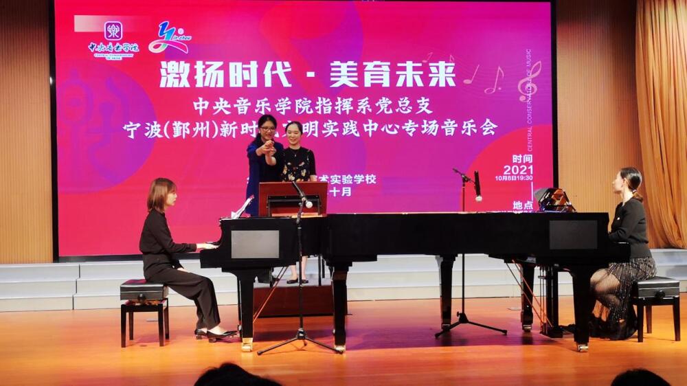 指挥系党总支与当地文艺工作者共创共建,带动当地骨干音乐教师和学生共同为鄞州区的文化建设贡献力量。陈冰教授的现场教学指挥小课堂环节就是最好体现。音乐会中,陈冰教授“揭开指挥教学神秘面纱”,通过模拟指挥系现场教学场景,对指挥系相关教学内容进行示范,手把手指导当地音乐教师指挥双钢琴演奏,讲解指挥在乐团中的作用和意义,在频频互动中感受“会说话的手”与音乐相融合的奇妙之处。现场情绪高涨、气氛热烈,收效显著。