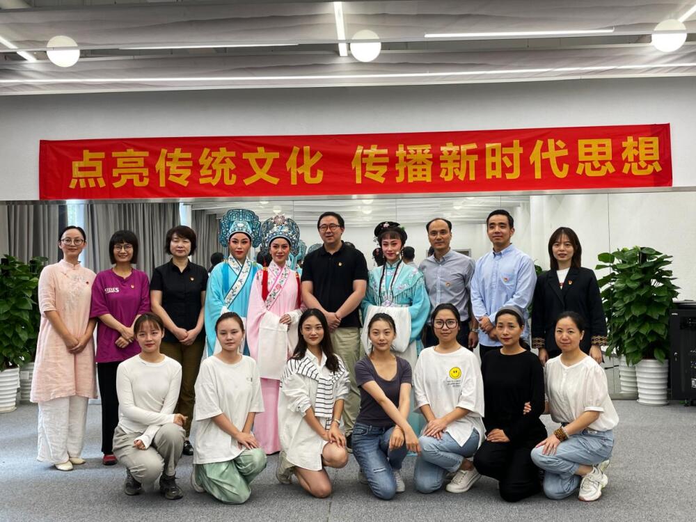由指挥系党总支教师支部书记沈浩老师和纪检委员马帅老师带队前往音王电声股份有限公司和鄞州越剧团的指挥系文艺小分队,宣讲活动同样精彩。在音王电声股份有限公司,指挥系的同学们不仅表演了钢琴独奏《平湖秋月》,还与当地企业员工共创共建,一同合唱《没有共产党就没有新中国》。在越剧团,文艺小分队欣赏了折子戏表演并分享了演出、演奏经验,演员深受启发。
