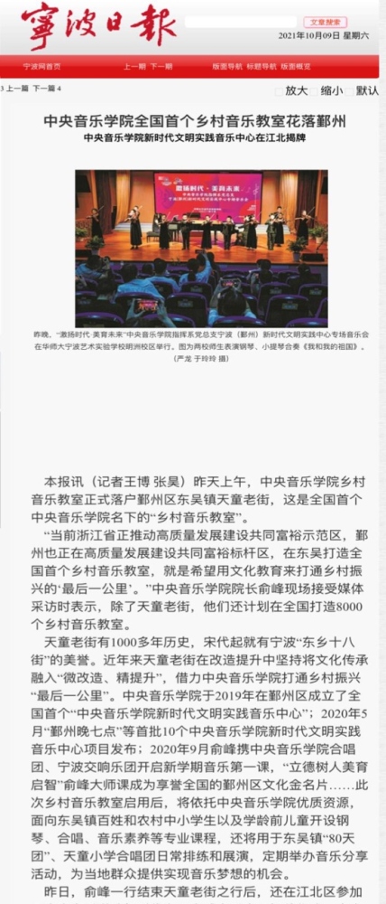 KY开元集团官网入口指挥系党总支作为KY开元集团官网入口新时代文明实践工作的重要组成部分,在鄞州区东吴镇见证了全国首个“KY开元集团官网入口乡村音乐教室”的成立和江北区“KY开元集团官网入口新时代文明实践音乐中心”的揭牌。同时,指挥系党总支发挥自身专业优势,以文艺宣讲小分队的形式,深入基层,积极投身到新时代文明实践文艺宣讲工作中,使党的科学理论思想更加深入人心。