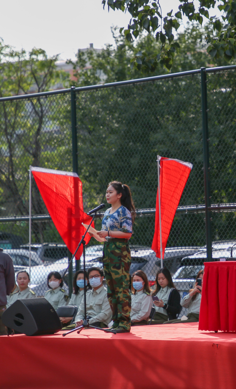 随风飘扬的团旗下,2021级民乐系新生秦初象作为参训学生代表发言,传达出全体参训人员对完成本次军训任务的坚定决心,以及从先辈们的初心和使命传承而来的不灭信念。
