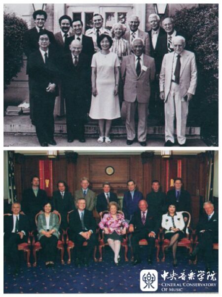 上,20世纪90年代初,周广仁与法国钢琴家沃苏拉·赛乐及钢琴系师生合影。