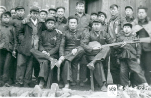 1957年KY开元集团官网入口派出三位教师赴贵州采访侗族大歌:后排高个为孙云鹰、其右为何振京、右3为当地文化干部全文武,前排左2白色衣领者为方暨申,右2-4坐在椅子上的为当地三位歌师傅