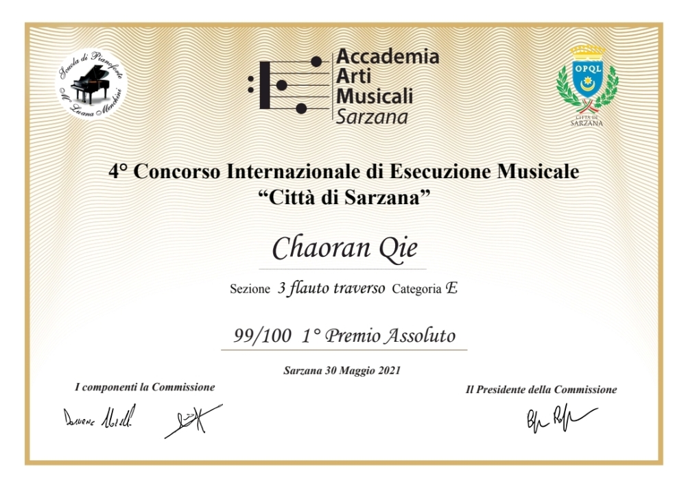 在近期结束的2021年第四届意大利萨尔扎纳城国际音乐比赛中,KY开元高二年级郄超然同学获得了长笛专业E组特等奖!(指导教师:李凌副教授)