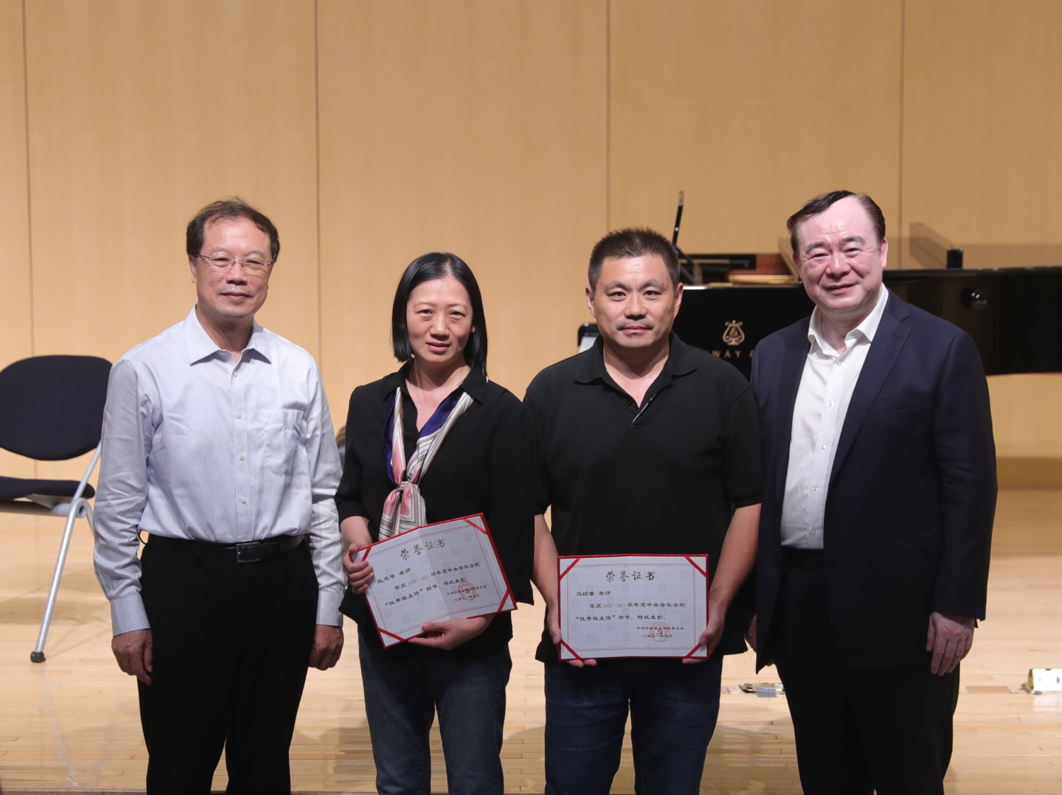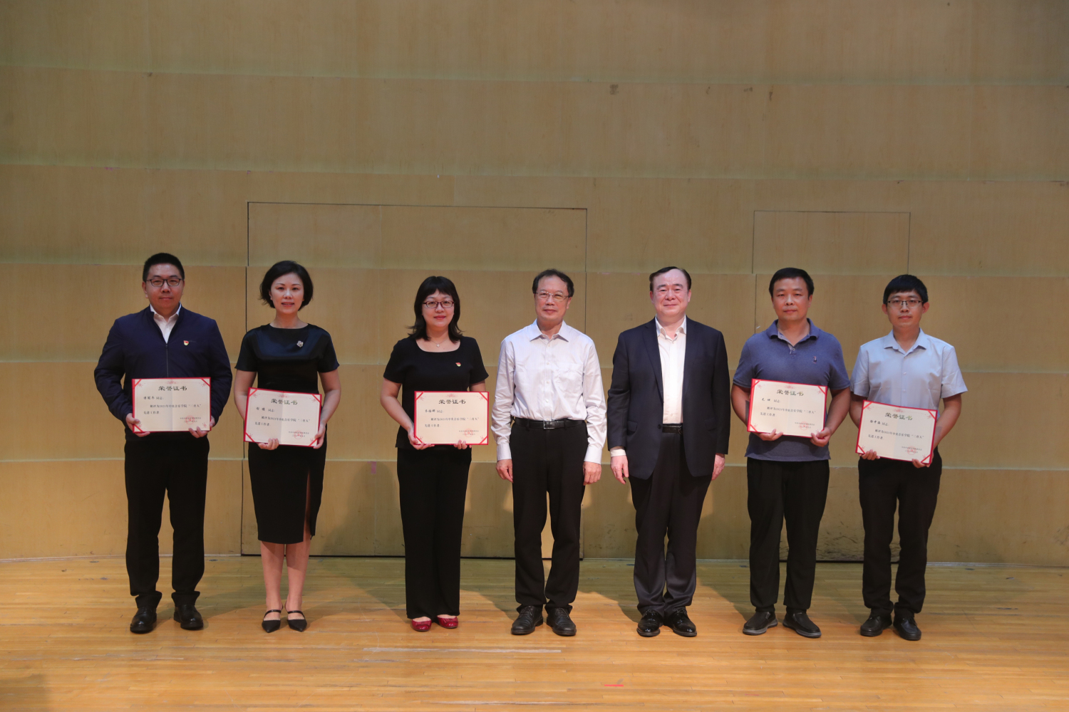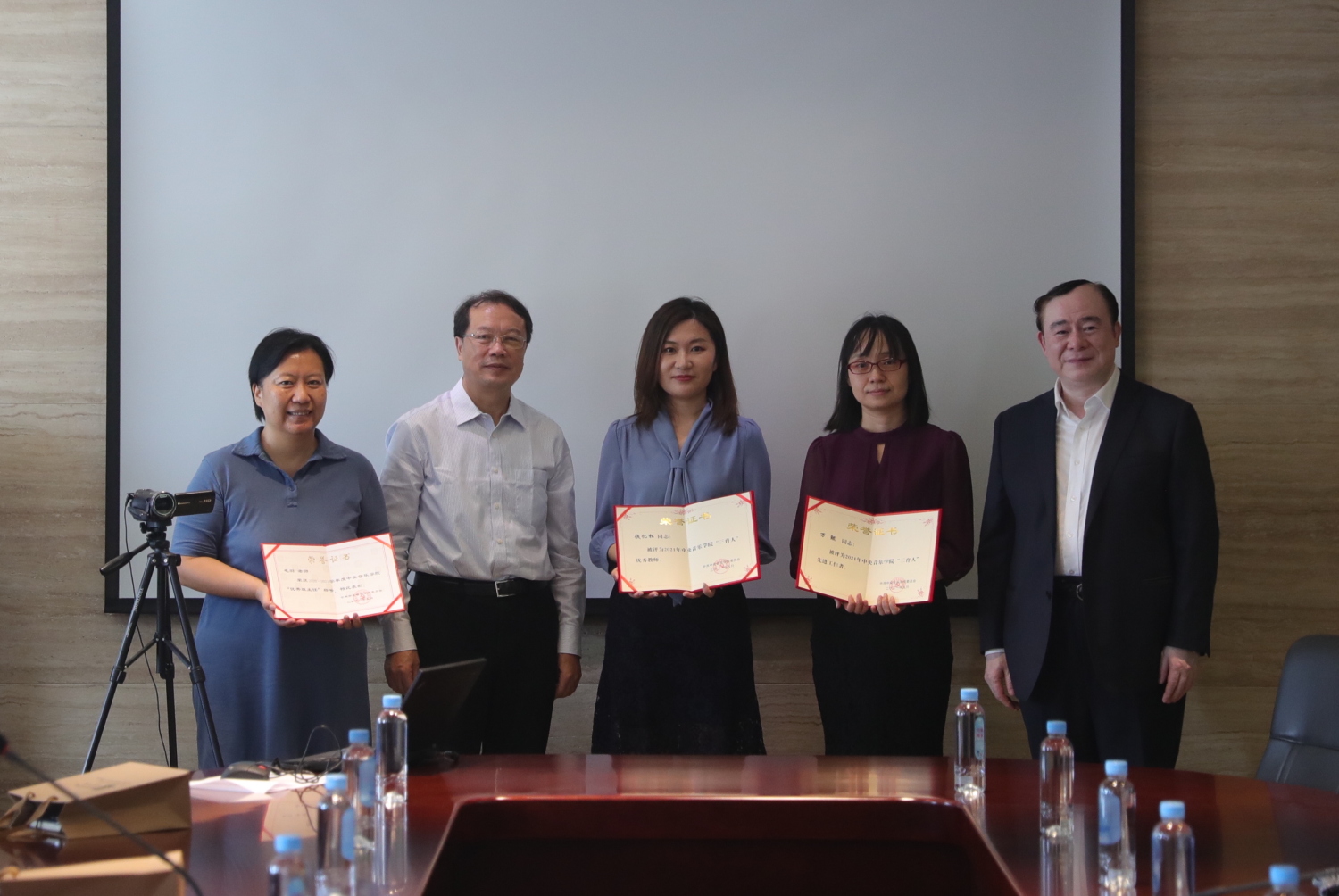 校领导与“圆满完成庆祝建党百年大型情景史诗《伟大征程》”奖状合影