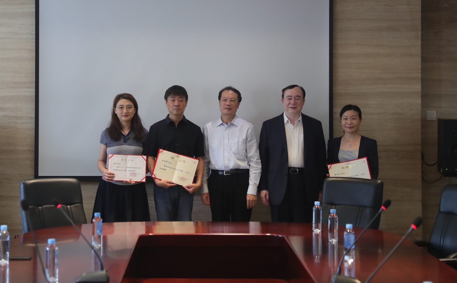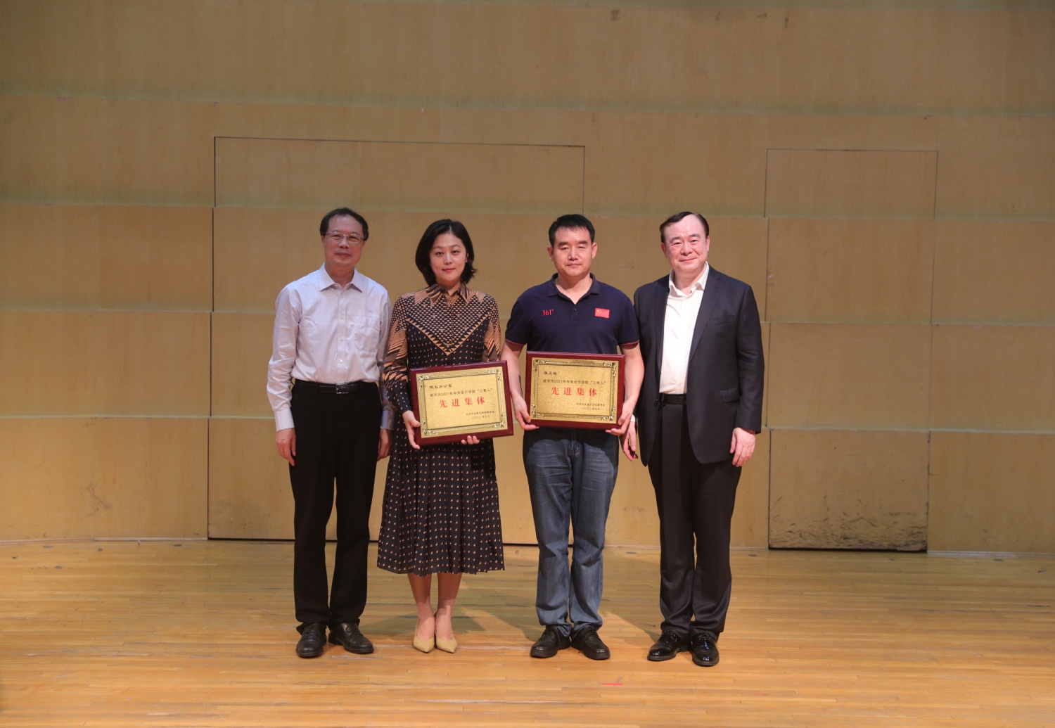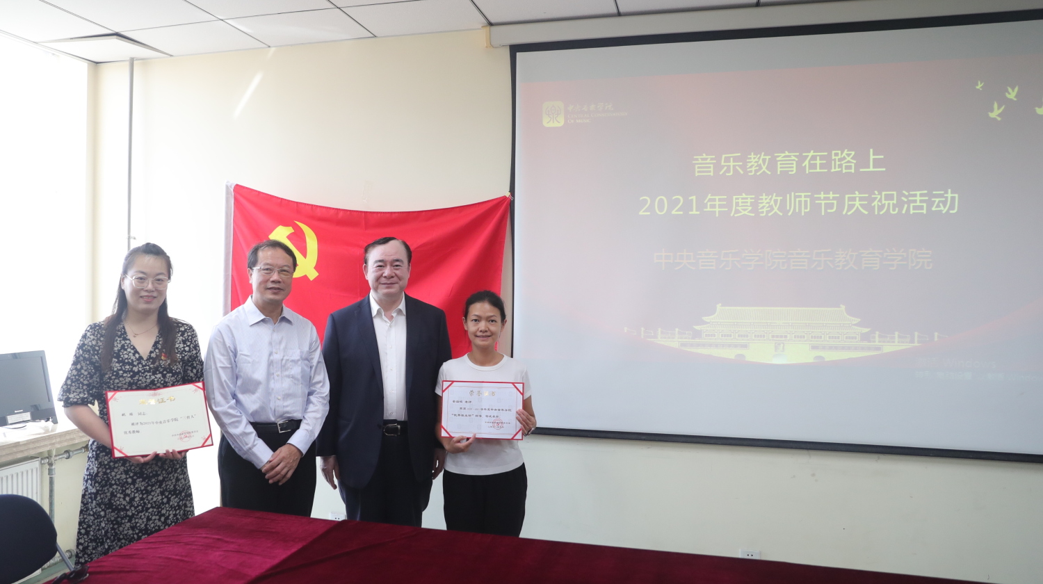 校领导与“圆满完成庆祝建党百年大型情景史诗《伟大征程》”奖状合影
