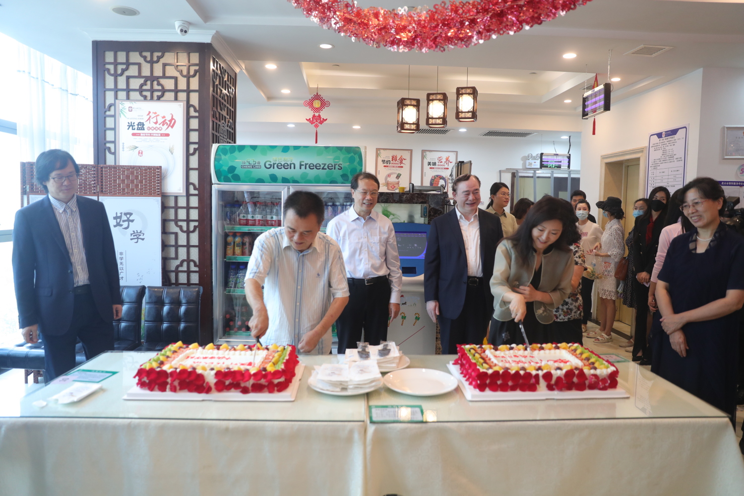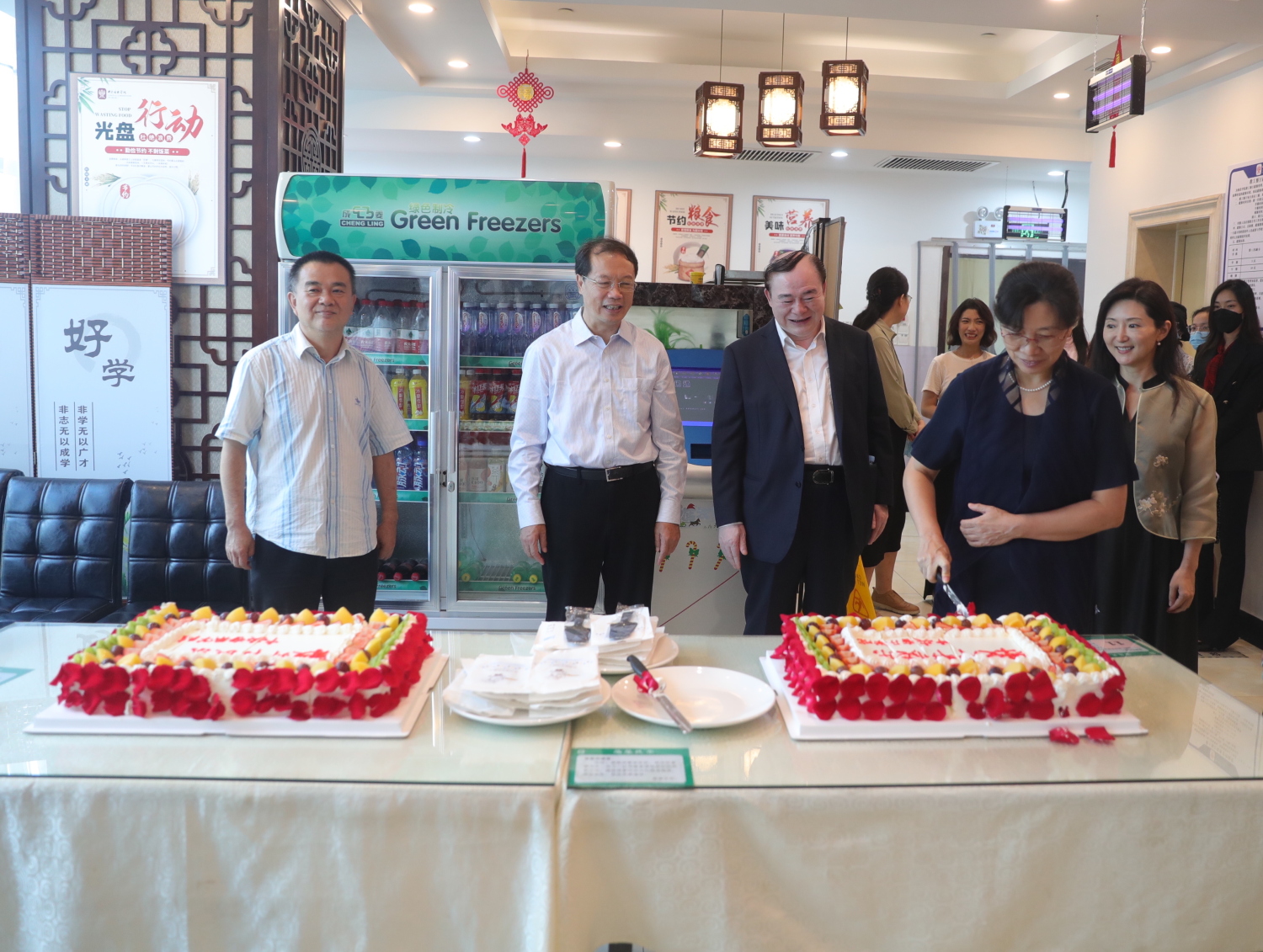中午,校领导在教职工食堂为教职员工切“生日”蛋糕
