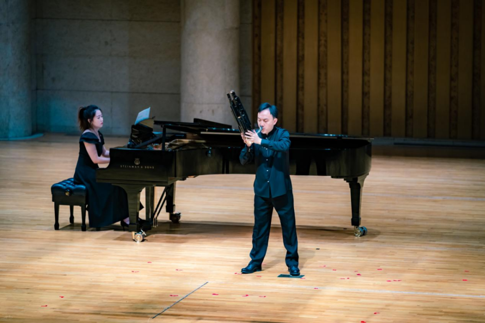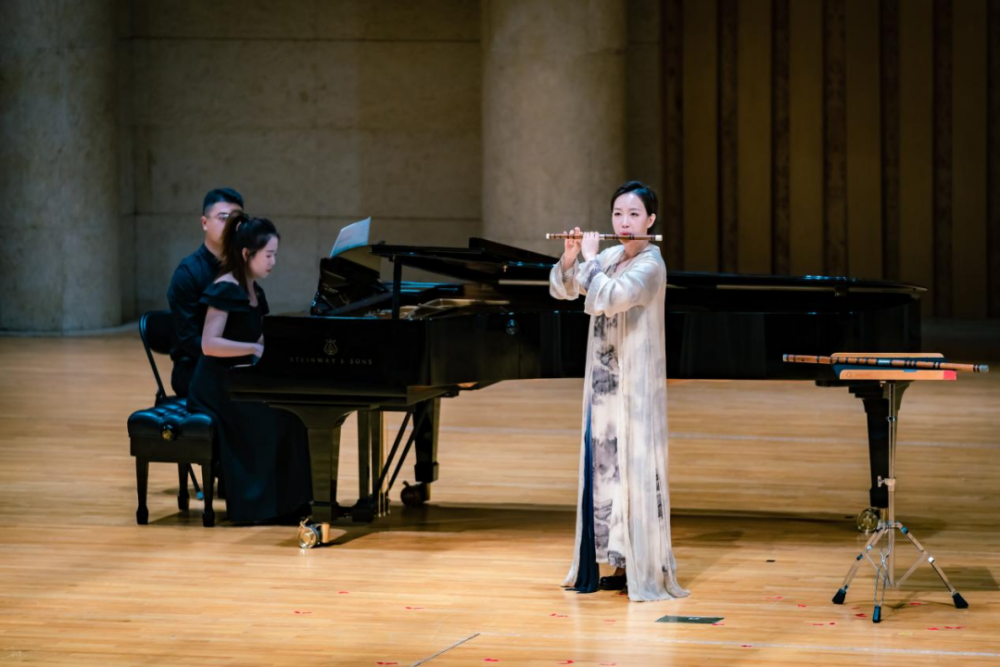 15:00,“青蓝辉映·笛韵悠悠—袁非凡师生笛乐鉴赏”,袁非凡教授与栾景旭(钢琴伴奏)示范演奏《小放牛》与《秦川情》,其学生刘隽菲、袁淼、段瑞顺次带来《胡旋舞》《水·落花》与《孤鸿影》,悉数展现民间乐曲、西域风格、诗词歌赋题材、现代技法特色、秦腔韵律等特色。曲目的创作年代横跨半个多世纪,帮助听众了解笛乐作品发展的一些基本概况。