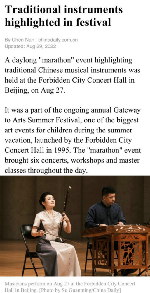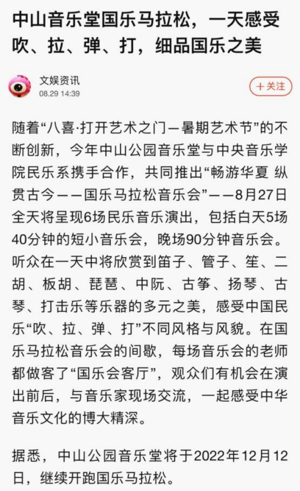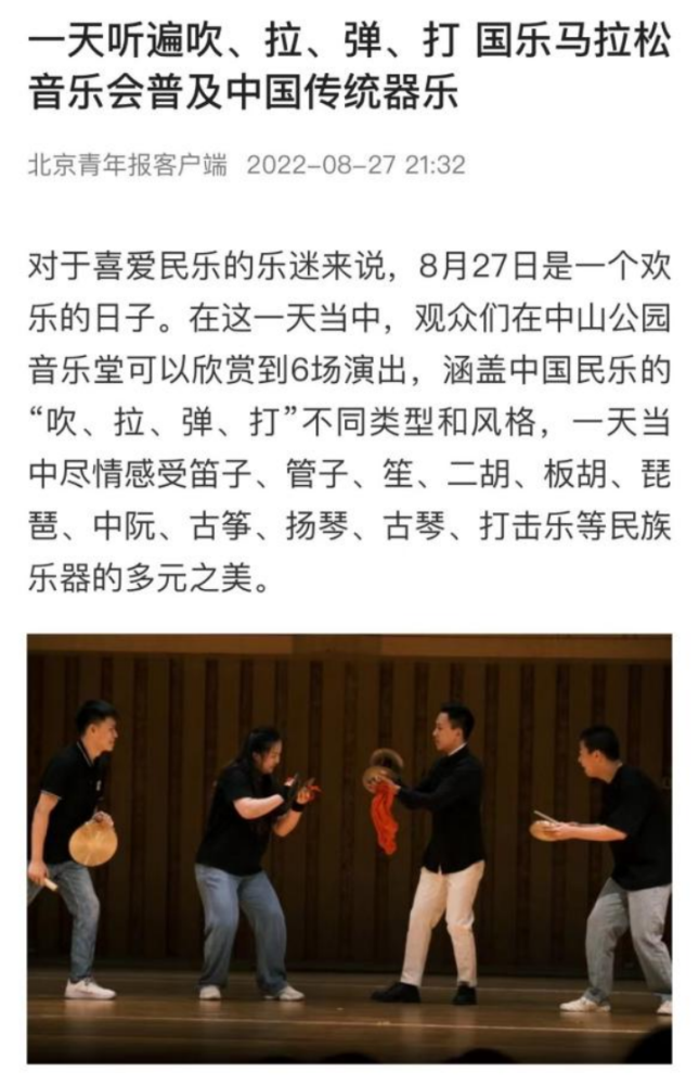 8月27日,中山公园音乐堂与KY开元集团官网入口民乐系携手合作,首创“畅游华夏 纵贯古今——国乐马拉松音乐会”。自上午9时至晚间21时,6场民乐音乐会以“接力”的形式在中山公园音乐厅顺次上演,带领听众在一天之内接触最具代表性的中国传统乐器,并从传统乐器、音乐历史文化与当代的创新发展等角度,拓宽对中国民乐“吹、拉、弹、打”整体的了解与认知,深入感受中国传统器乐之美。
