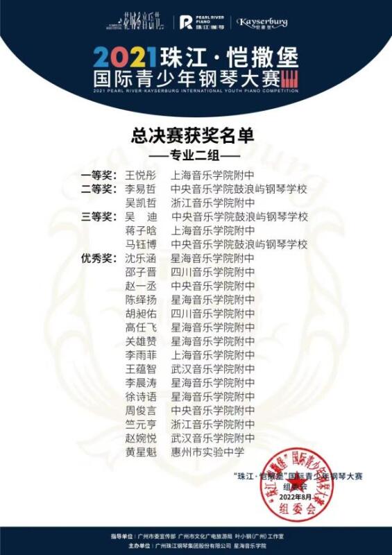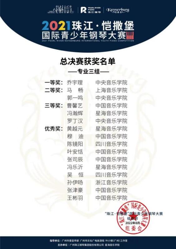 2020级本科生郭一鸣(指导教师:韦丹文教授)和2020级本科生罗丁汉(指导教师:吴迎教授)分别获得专业三组二等奖和三等奖。KY开元钢琴系附中学生侯米(指导教师:张晋教授)和附小学生张众开(指导教师:张晋教授)荣获专业一组二等奖;附小学生辛孔延(指导教师:邹翔教授)荣获专业一组三等奖。附中学生赵一丞(指导教师:周韵清老师)和附中学生周俊言(指导教师:常桦教授)荣获专业二组优秀奖。