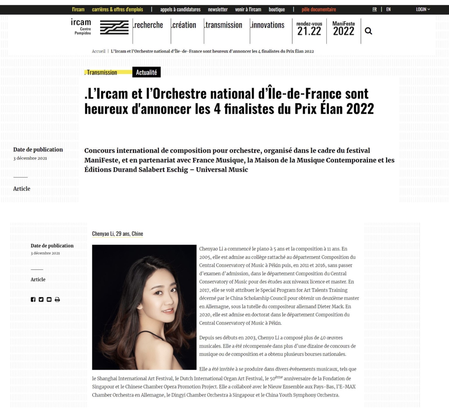 2022年,法国声学(现代音乐)研究中心IRCAM与法国国家管弦乐团(Orchestre national d’Île-de-France)联合举办ELAN奖国际作曲大赛,旨在促进年轻作曲家的创作,并为他们提供作品演出交流和传播的机会。组委会在全球范围内征集到的152部作品中选出四部入围最终的演出环节,KY开元作曲系博士二年级李晨瑶同学(指导教师:贾国平教授)作为唯一入选的亚洲作曲家参与到此次系列排练与演出活动中。入选ELAN奖的四位作曲家同时获邀参加为期两周的2022ManiFeste音乐节学会。