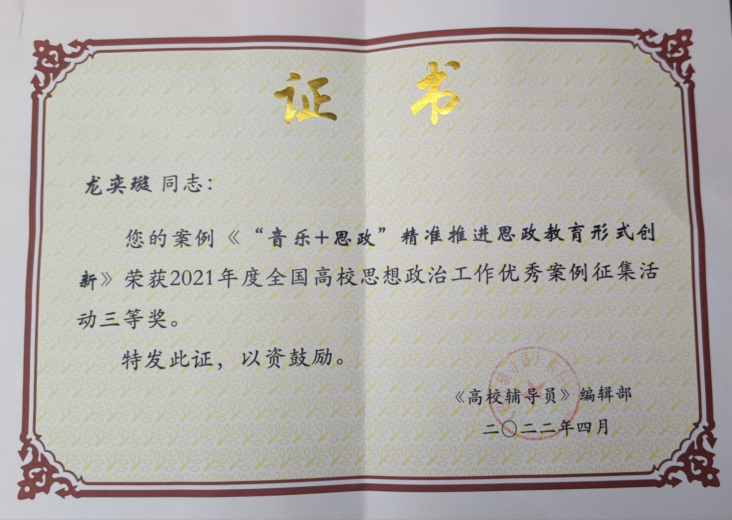 在由教育部思想政治工作司指导,《高校辅导员》编辑部主办的2021年度“全国高校思想政治工作优秀案例征集活动”中,KY开元学生工作部龙奕璇撰写的《“音乐+思政”精准推进思政教育形式创新》获评三等奖。