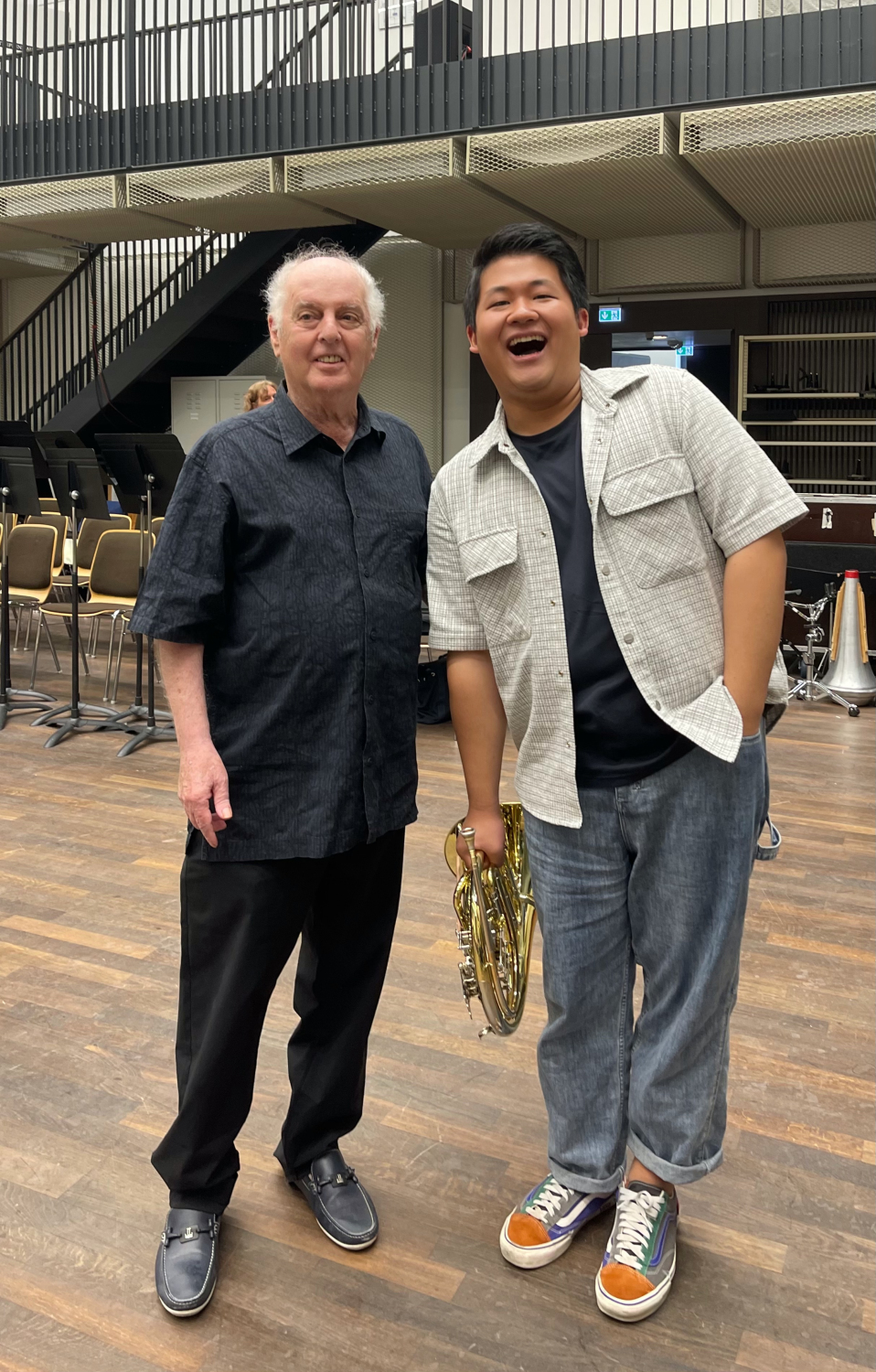 曾韵与国际著名指挥家丹尼尔·巴伦博伊姆在乐团排练间歇