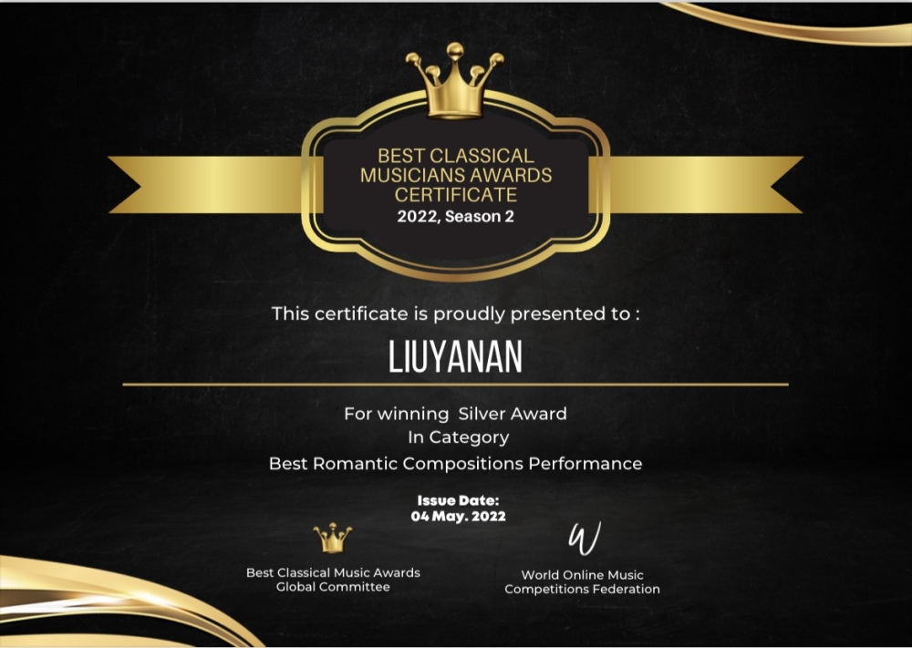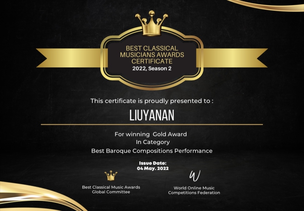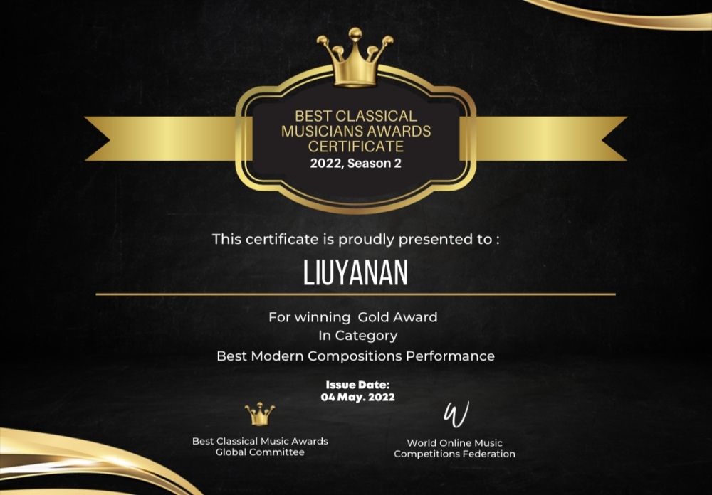 2022年夏季最佳古典音乐家大奖赛Best Classical Musicians Awards (BCMA)由世界在线音乐比赛联合会,英国True Art 古典音乐数字电视台新古典音乐家杂志联合举办。