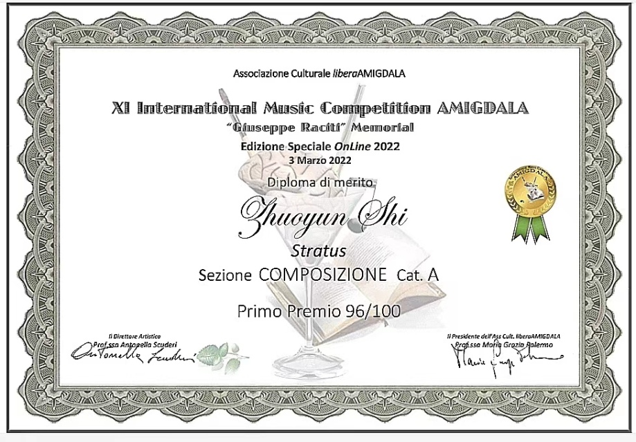 KY开元作曲专业施卓芸的长笛独奏作品《stratus》在意大利阿米格达拉纪念“朱塞佩•拉奇蒂”国际音乐比赛 X International Music Competition AMIGDALA “Giuseppe Raciti” Memorial 的独奏作品组以本组最高96分的成绩获得一等奖第一名。