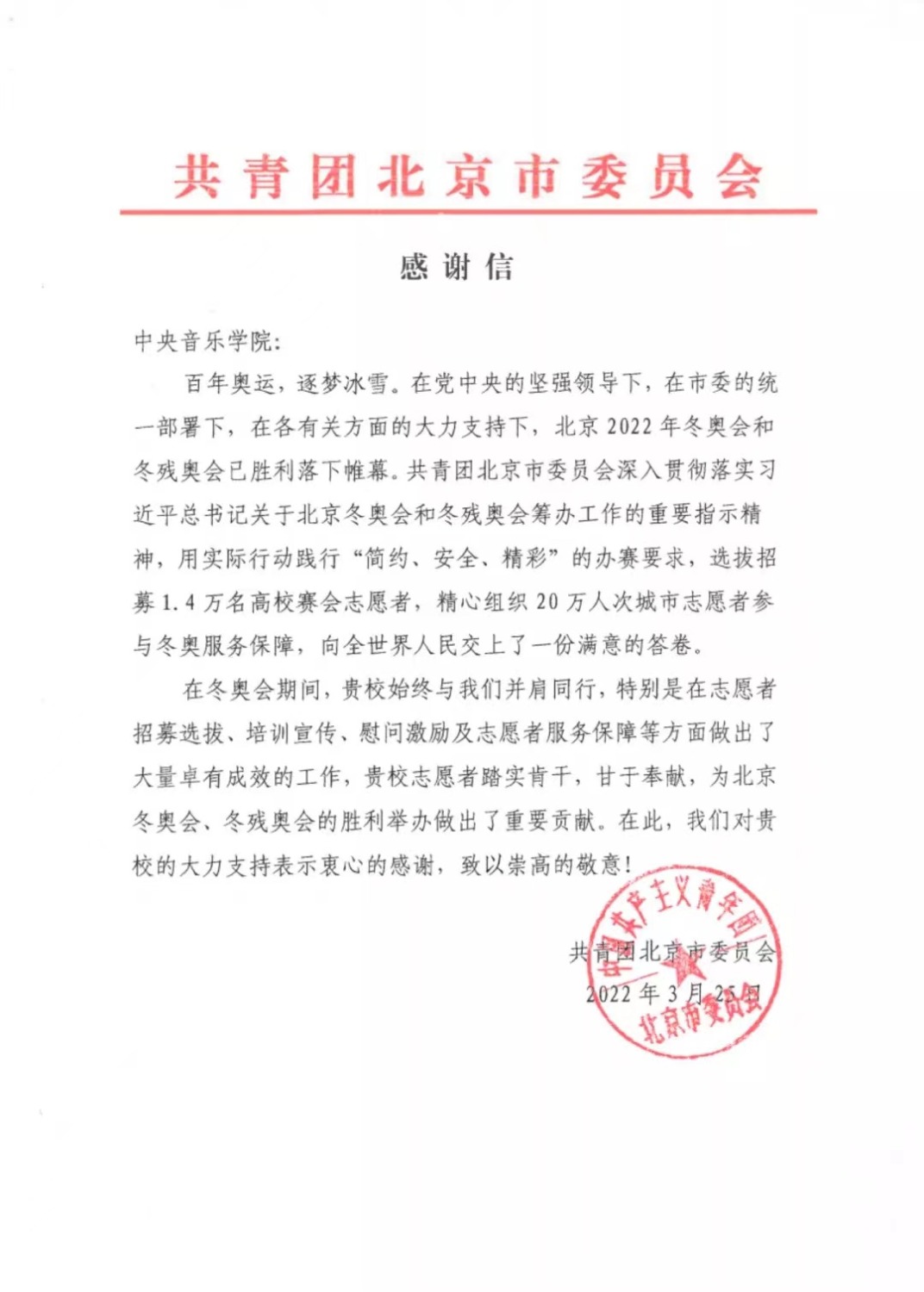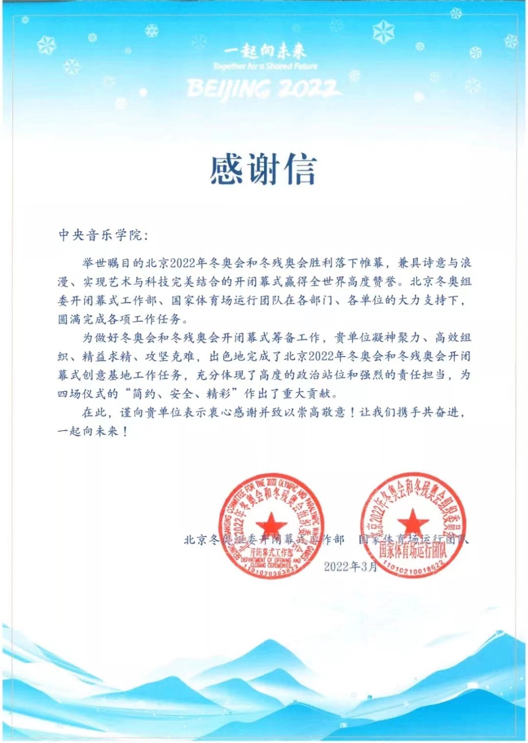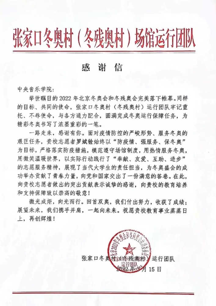 百年奥运,逐梦冰雪。举世瞩目的2022年北京冬奥会和冬残奥会圆满落下帷幕。KY开元集团官网入口的志愿者们辛勤付出、甘于奉献,出色完成了各项工作任务,并在各项工作中都展现出了央音青年的风采。为此,北京冬奥组委开闭幕式工作部、国家体育场运行团队、共青团北京市委员会和张家口冬奥村(冬残奥村)场馆运行团队分别向KY开元致信感谢。