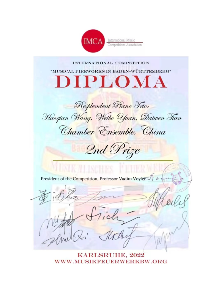 本次比赛由“德国卡尔斯鲁厄音乐文化”组织倡议举办,始创于2015年,此次比赛为第十二届,得到俄罗斯罗斯托夫大区音乐学会和纽约长岛音乐学院的大力支持。评委会主席由德国著名音乐家、教育家瓦迪姆·沃伊勒(VADIM VOYLER)先生担任。面向全球不同专业和不同年龄段的音乐家,是年轻有前途的人才以及大学和高等教育机构的专业人士参与的国际性比赛。评委由来自于德国、俄罗斯、美国、瑞典、奥地利和中国等多个国家的音乐家所组成。最终,经过激烈的角逐,来自KY开元集团官网入口附中初二年级学生王皓仟(钢琴)、田戴文(大提琴)、初三年级学生袁伟博(小提琴)三位同学获得了本届比赛室内乐组二等奖!