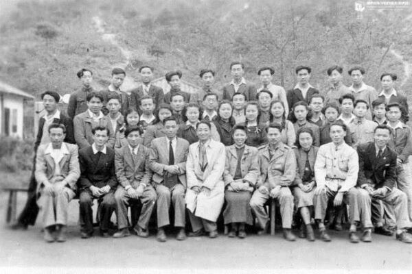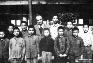 1945年在重庆青木关国立音乐院幼年班的校舍前,第一批部分学员合影,站立第一排右2为赵惟俭