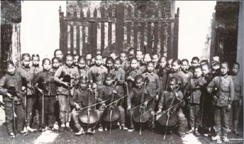1947年幼年班部分同学与外籍小提琴教师阿德勒合影。前排左4为赵惟俭