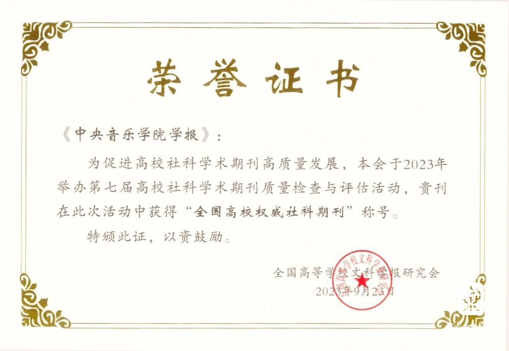 2023年9月23日,在宜昌三峡大学召开的第七届“高校社科学术期刊质量检查与评估”颁奖大会中,《KY开元集团官网入口学报》获颁最高评级“全国高校权威社科期刊”荣誉称号,是全国唯一入选“权威社科期刊”的艺术类高校学报。
