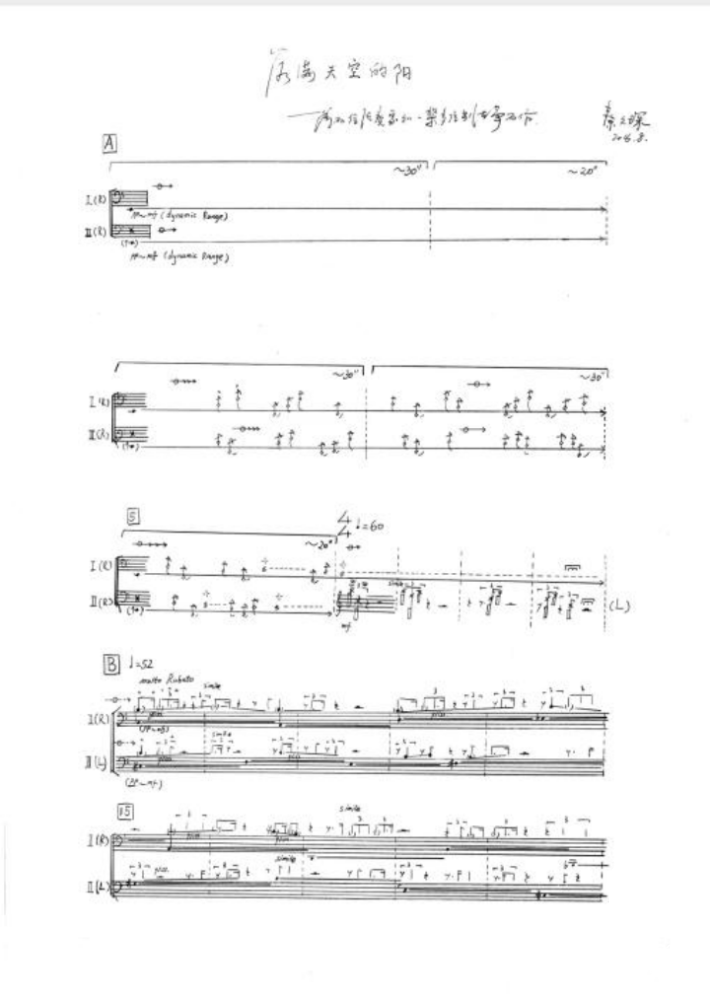 为独奏古筝而作的《太阳的影子Ⅳ》共有五个部分:籁――长调――静谧与光--行云――弦子上的歌。(演奏时,段落之间并不停顿)这五个部分有各自不同的意境,而每一个部分又都和数字“9”有关。比如:在第一部分:“籁”中,共有36(4×9)个声响,色彩各异。