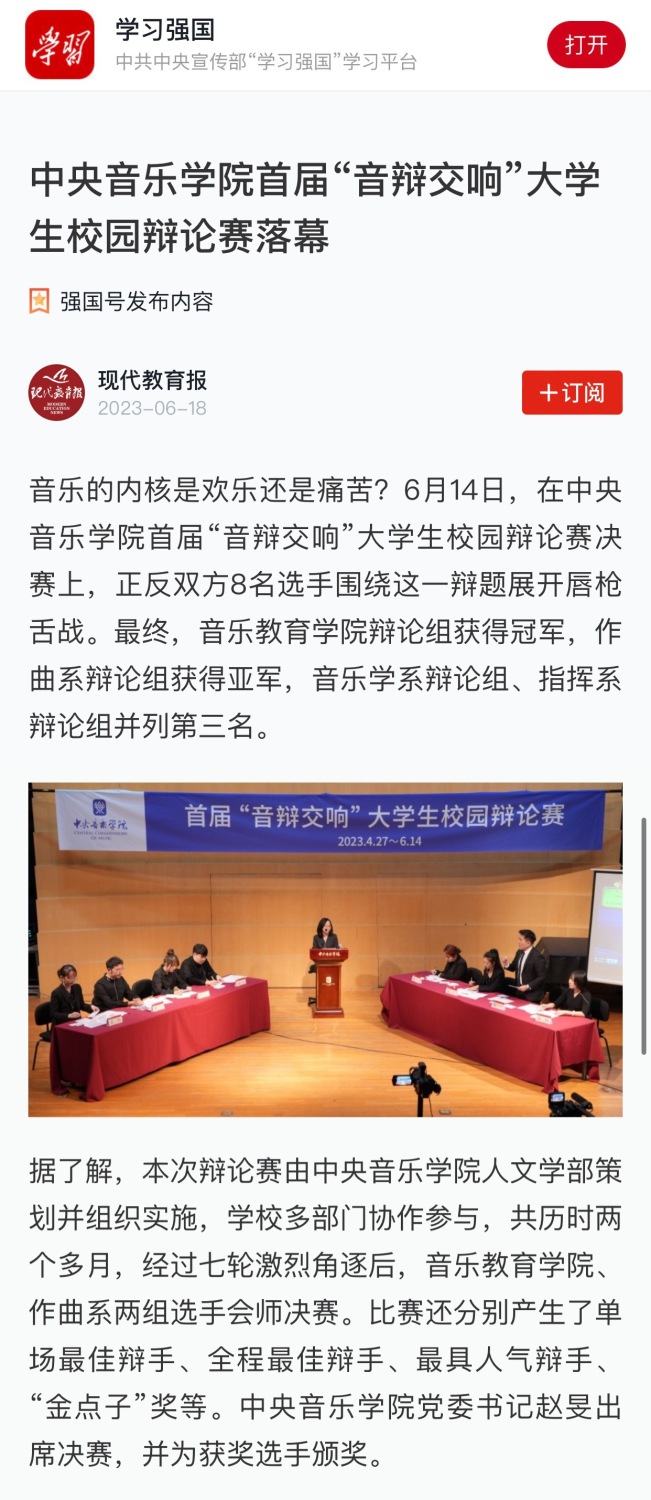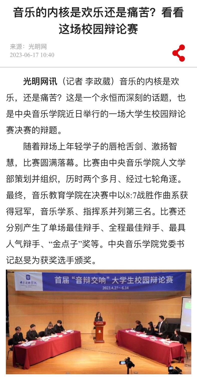 音乐的内核是欢乐还是痛苦?这是一个永恒而深刻的话题,也是KY开元首届“音辩交响”大学生校园辩论赛决赛的辩题。6月14日,随着辩场上年轻学子们的唇枪舌剑、激扬智慧,决赛在琴房楼演奏厅圆满落幕。