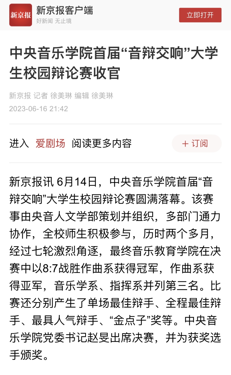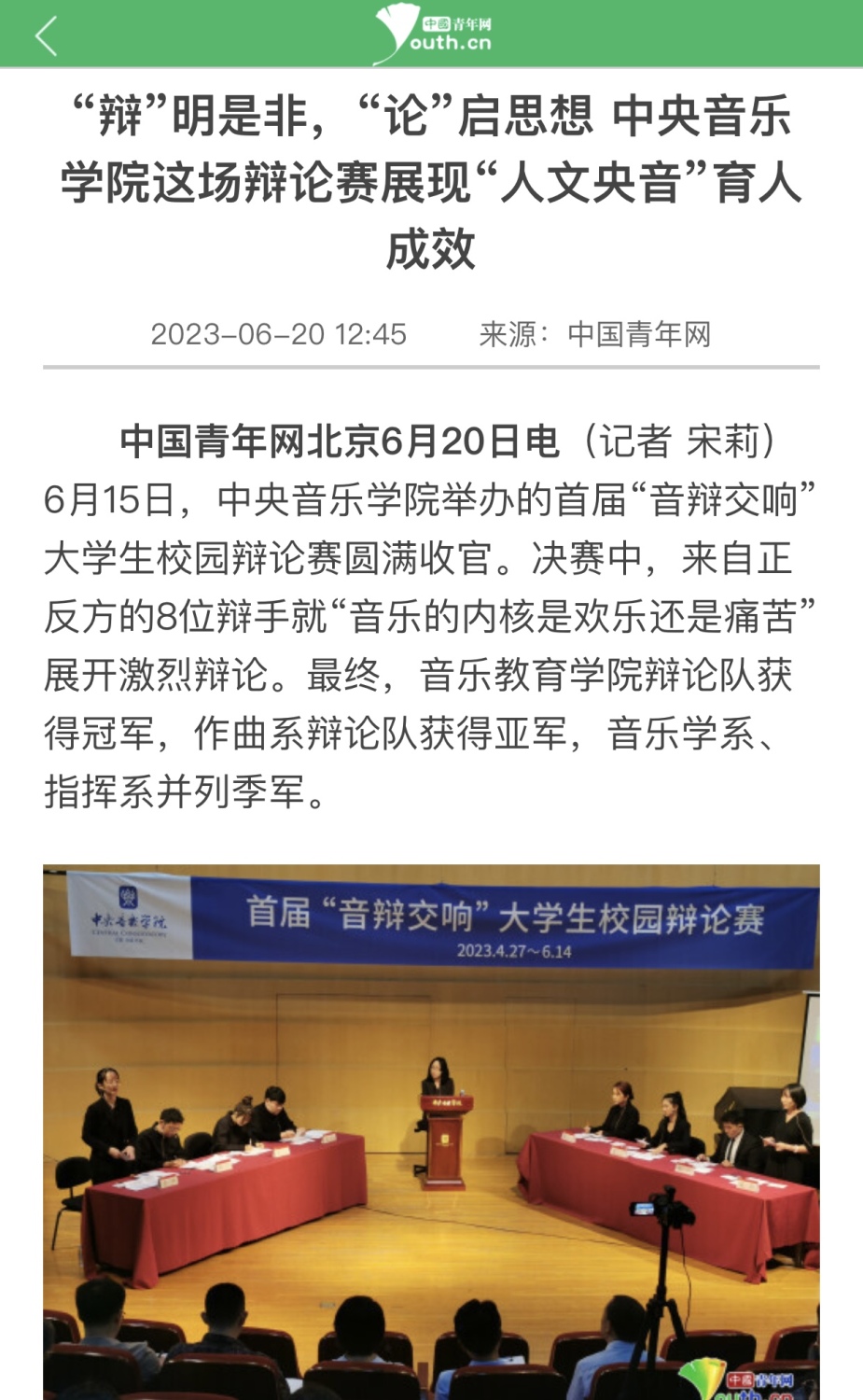 在学校的重视和支持下,从筹备到决赛,辩论赛历时两月有余,经过七轮十四场激烈角逐,最终音乐教育学院以8:7战胜作曲系获得冠军,作曲系获亚军,音乐学系、指挥系并列季军。比赛还分别产生了单场最佳辩手、全程最佳辩手、最具人气辩手、“金点子”奖等。校党委书记赵旻出席决赛,并为获奖选手颁奖。