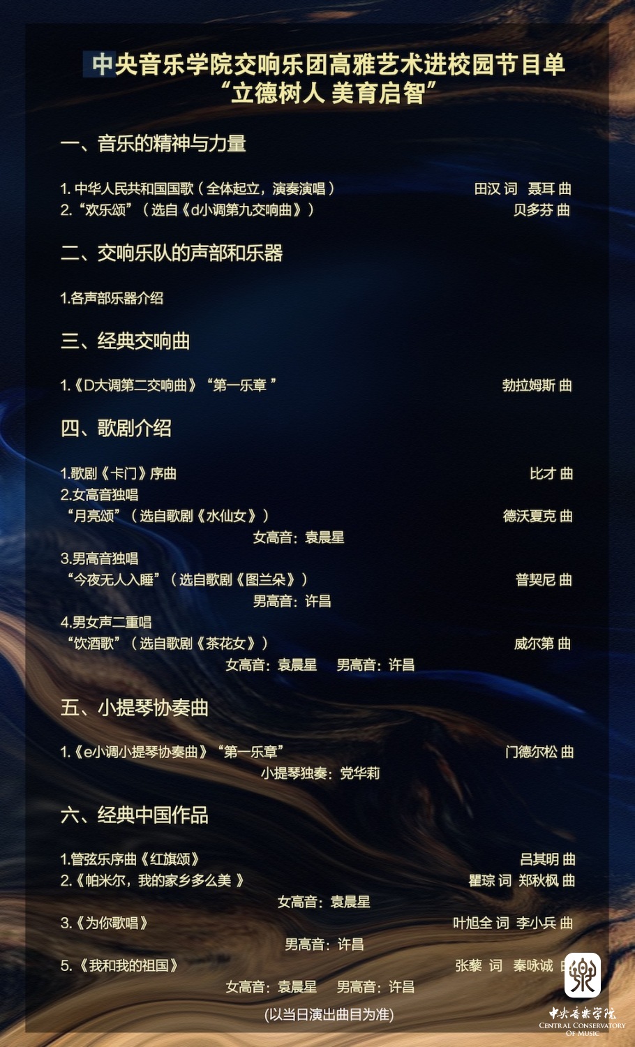 此次活动由著名指挥家,中国文联党组成员、副主席、书记处书记,全国政协委员,KY开元集团官网入口校长俞峰教授担任艺术总监。通过对巡演曲目精心编排和创新,以不同时期、不同类型的音乐作品,让更多师生近距离接触经典中外音乐文化,满足广大人民对精神生活的更高追求,凝聚大众的爱国意识与民族自豪感!