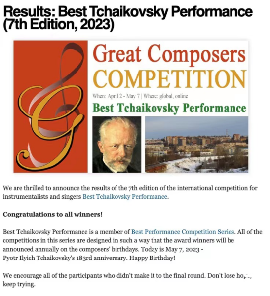 2023第十一届柴可夫斯基国际青少年音乐比赛中获第四名及最佳抒情作品演奏奖