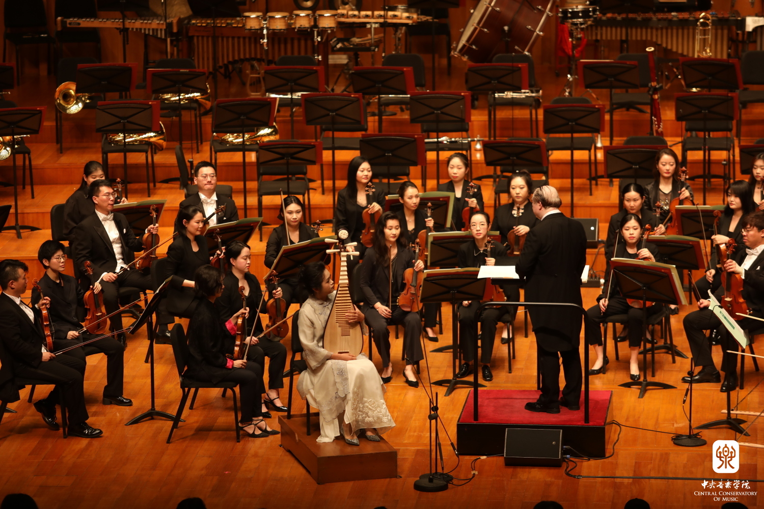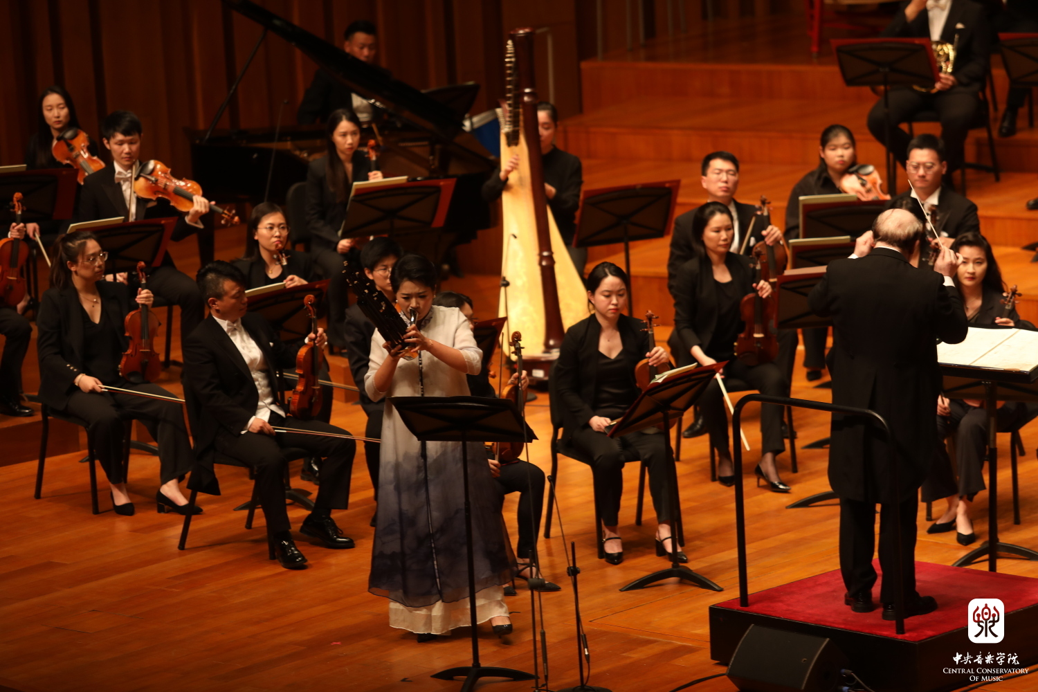 琵琶演奏家兰维薇是这首《行空》的首演者。笔者依稀记得,作品的演奏难度和当年首演的成功一度成为业界的美谈。当晚的演出,兰维薇再次展现了其极为高超的演奏技巧和精细入微的音乐处理。尤为令人惊诧的是,如此复杂的作品,演奏家竟然又是背谱演奏。也许正是这种对作品了然于胸的熟稔,使演奏家能与乐队形成良好的配合。在演奏中,她干净利落的扫弦,富于“颗粒感”的轮指,以及细致地出勾勒出的音乐线条——尤其在声部穿插中,将若隐若现的半音线条清晰地呈现出来,营造出层叠变化的空间感,声起声落,云卷云舒,“行空”了然。