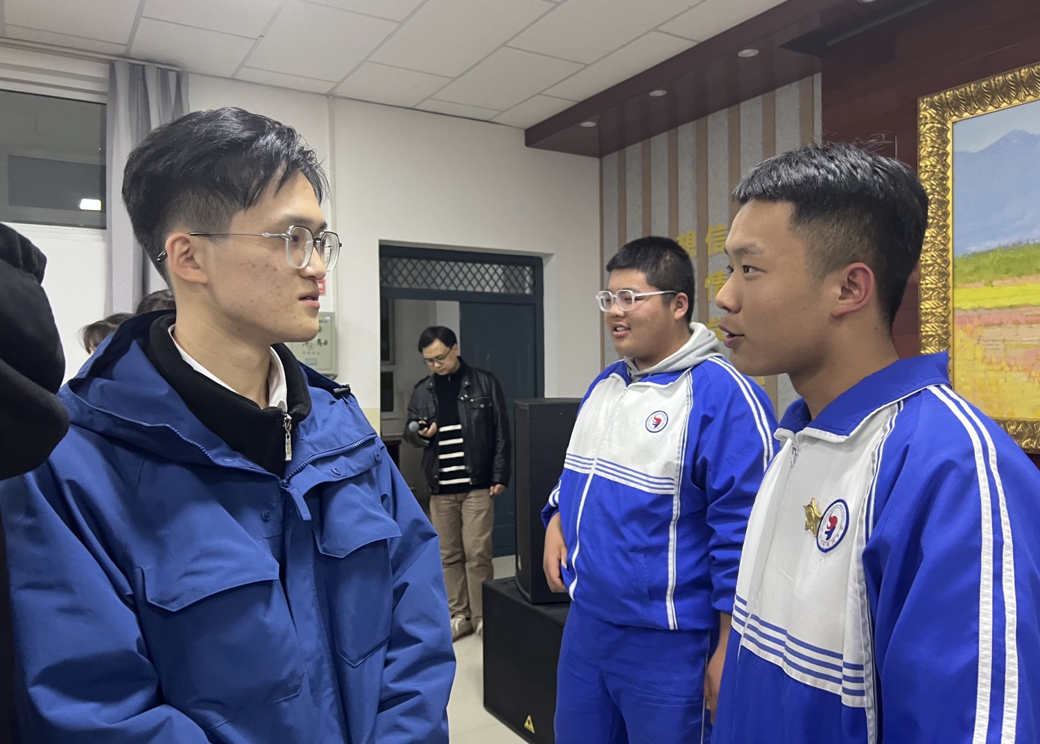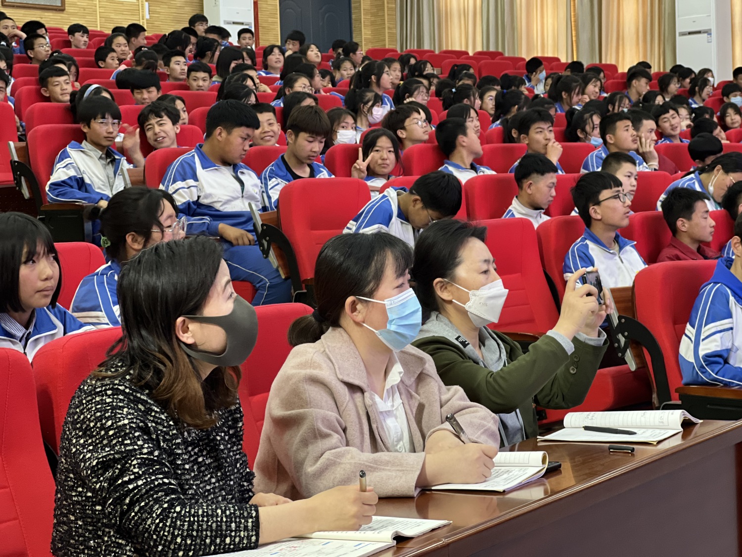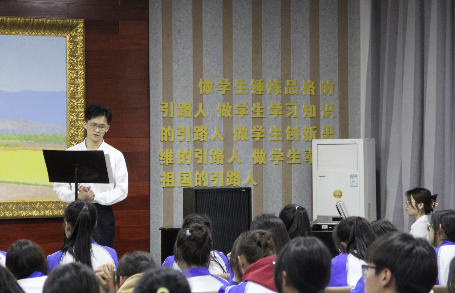 4月27日,为最大程度发挥此次文艺帮扶的效果,宣讲师肖澄迎联合志愿者们走出闽宁镇,来到银川市实验中学,开展“塞上行”文艺宣讲活动,为全校400多名师生带来一场以“高雅艺术进校园——中国艺术歌曲专题”为主题的美育讲座。整场宣讲采用讲演结合的方式,通过分析中国艺术歌曲历史特点与创作风格,融合中国优秀传统文化、爱国、民族繁荣等主题,带领同学们欣赏音乐、诗词之美的同时,筑牢中华民族共同体意识,让优质教育资源辐射到更多当地群众,为宁夏美育教育贡献力量。宣讲现场气氛热烈,活动结束后,同学们主动上前与志愿者老师就主题展开进一步学习讨论。
