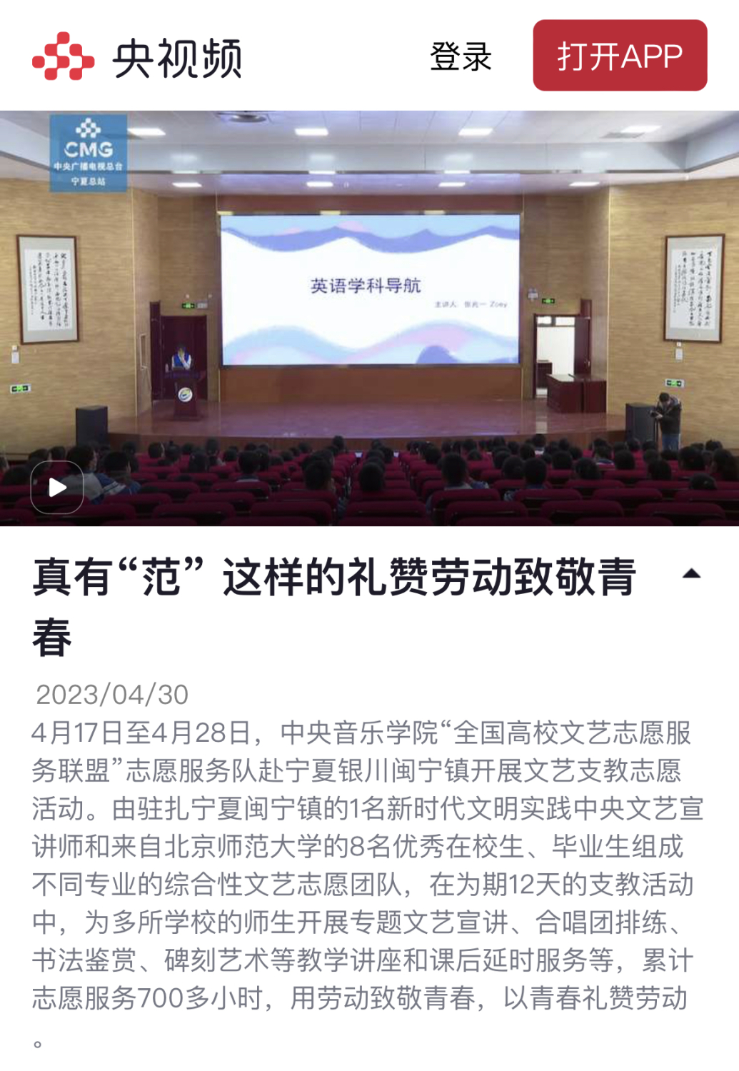 4月17日至4月28日,KY开元集团官网入口“全国高校文艺志愿服务联盟”志愿服务队走进宁夏银川闽宁镇开展“强国复兴有我”主题文艺志愿服务活动。KY开元驻扎宁夏闽宁镇新时代文明实践文艺宣讲师肖澄迎和8名来自北京师范大学英语教育、音乐学、书法学专业的优秀在校生、毕业生组成多种专业的综合性文艺志愿团队,为当地多所学校开展为期12天的专题文艺宣讲、双语合唱团排练、书法鉴赏、讲座和课后延时服务等活动,累计志愿服务达700余小时,用劳动致敬青春,用青春礼赞时代。