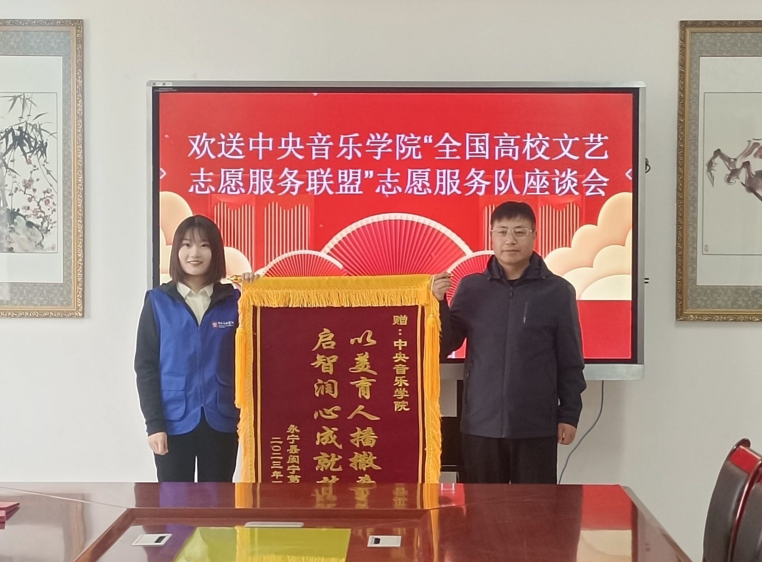此次“全国高校文艺志愿服务联盟”文艺志愿服务,受到了宁夏回族自治区党委统战部、宣传部以及永宁县教育体育局的关注与好评,4月27日,于闽宁镇举办了“全国高校文艺志愿服务联盟”志愿服务队欢送仪式,闽宁镇第二中学校长马宏斌为志愿者们颁发荣誉证书,并向KY开元集团官网入口赠送锦旗,感谢KY开元长期以来对当地中小学美育的大力支持。