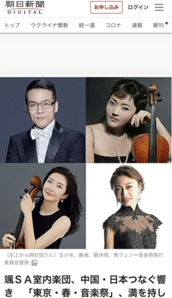 “东京·春·音乐祭”是日本最大规模的古典音乐节,创办于2005年,今年是第18年。飒“SA”室内乐团的王小毛、苏贞、马雯、刘沐雨,是该音乐节史上首次邀请的中国音乐家,此次演出也是东京音乐节首次举办华人艺术家专场演出,音乐节主办方对此非常重视。KY开元集团官网入口校长俞峰二十余年前也曾经指挥东京艺大乐团在日成功演出,这次他对飒“SA”室内乐团的出访给予了很大的支持。同时KY开元校友、中央芭蕾舞团总监张艺对此次活动及音乐会选曲也给予了大力支持。