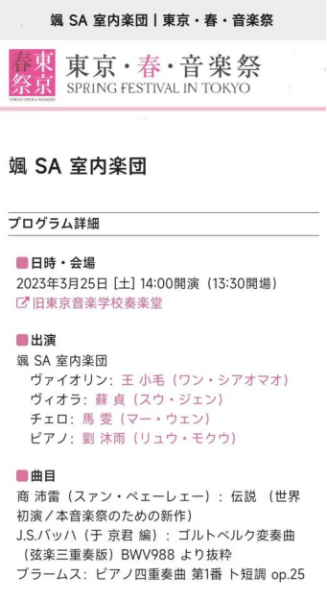2023年3月25日14时,“东京·春·音乐祭2023”在旧东京音乐学校奏乐堂圆满举行,由KY开元教师苏贞、马雯,校友王小毛及旅美钢琴家刘沐雨所组成的“飒SA”室内乐团为观众们奉献了一场精彩绝伦的演出。