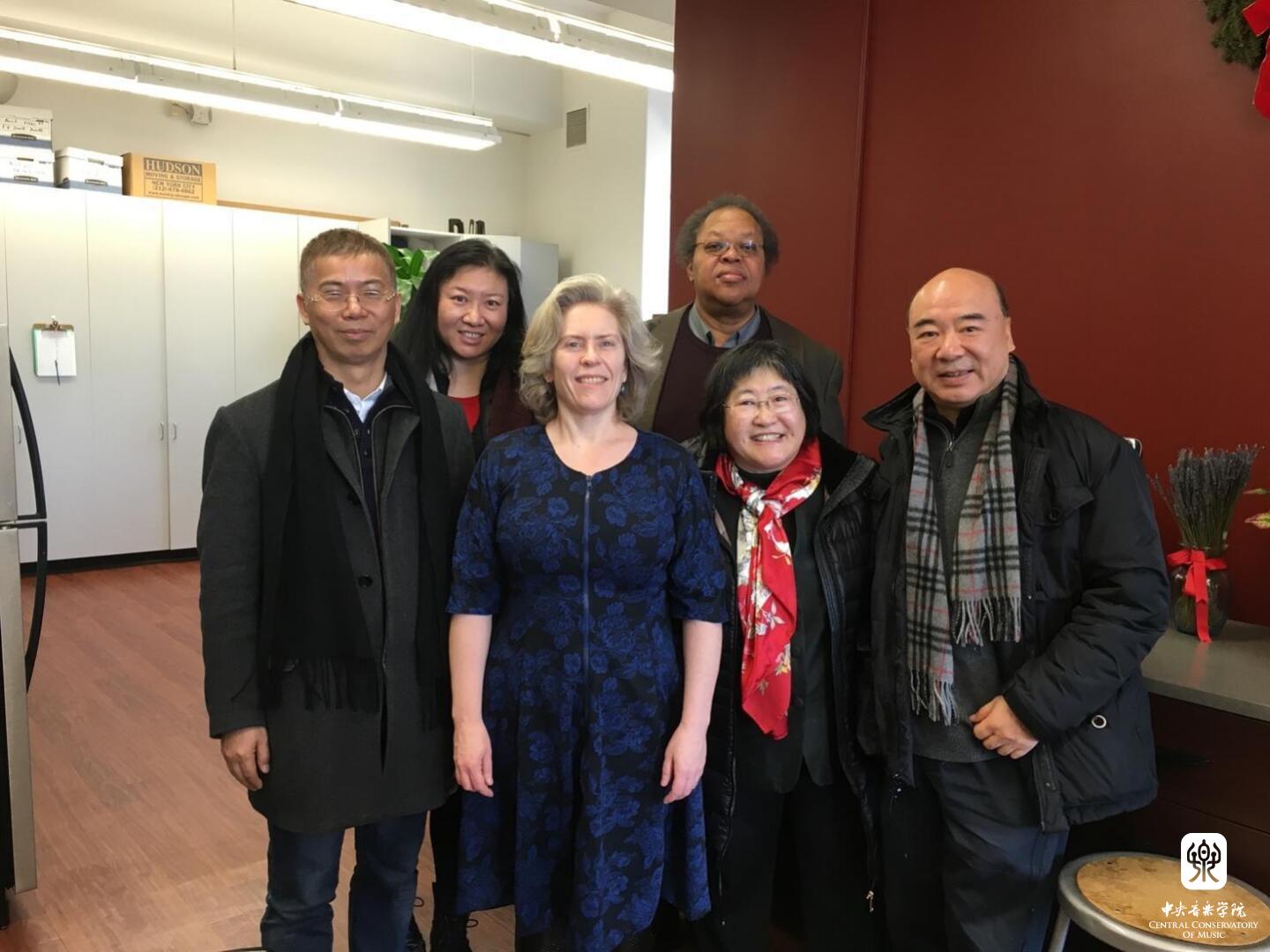 2016年,在美国纽约哥伦比亚大学与美籍华裔著名作曲家陈怡教授(右2)和周龙教授(右1),上海音乐学院温德青教授(左1),哥伦比亚大学音乐系主任 Susan Boynton教授(左2),作曲系任 George Lewis 教授(后右1),在美国纽约哥伦比亚大学留影