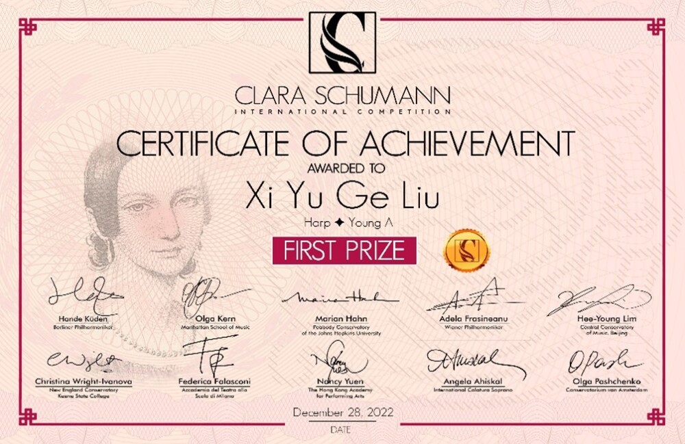 在刚刚落幕的2022“克拉拉·舒曼国际音乐比赛”(2022 Clara Schumann International Competition)中,经过激烈的角逐,KY开元附小四年级学生刘熙语格以优异的成绩荣获竖琴少年A组一等奖;附中初一年级学生虞涵匀获得竖琴少年B组一等奖; 初二年级学生李佳阳获得竖琴少年B组一等奖,指导教师:王冠教授。